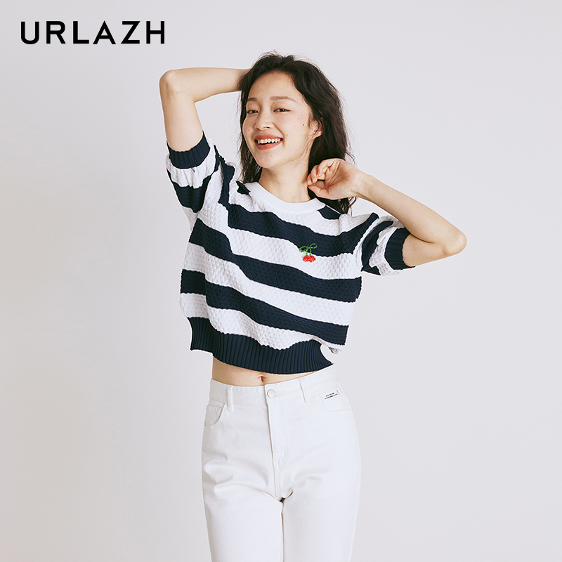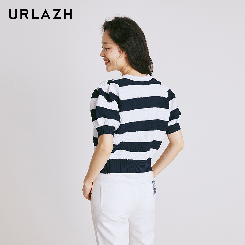 URLAZH有兰夏季新款复古气质黑白条纹泡泡袖短袖圆领针织衫女短款
