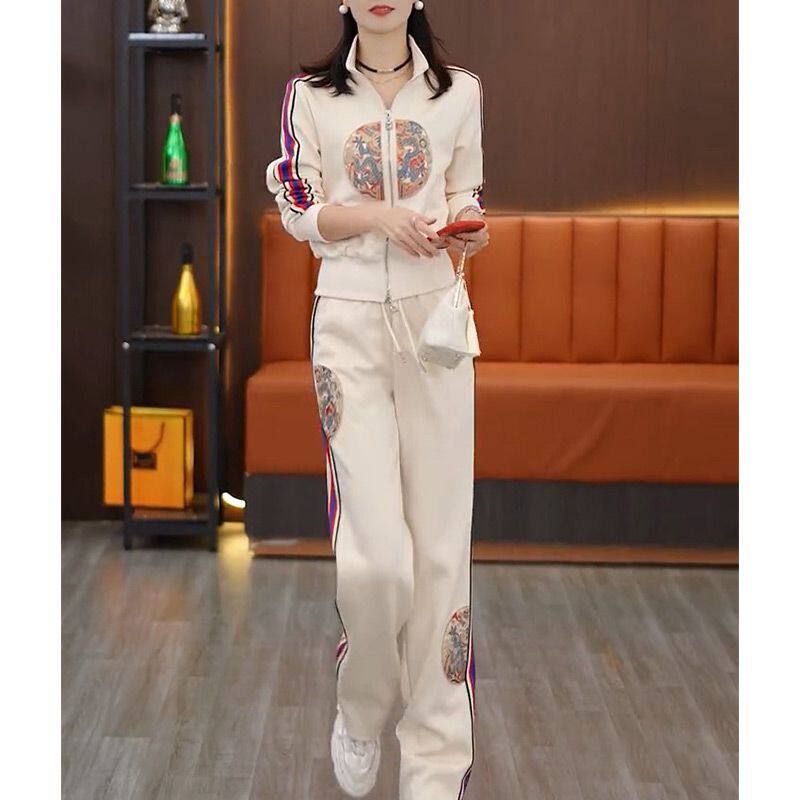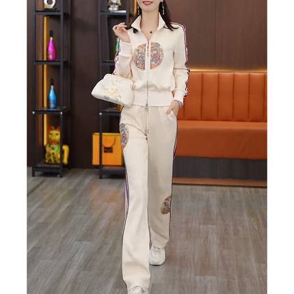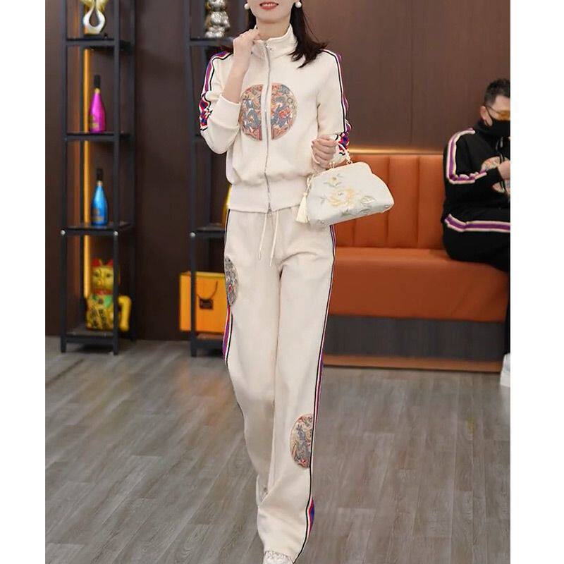 时尚休闲套装女2026春季新款气质收腰显瘦国风刺绣上衣长裤两件套