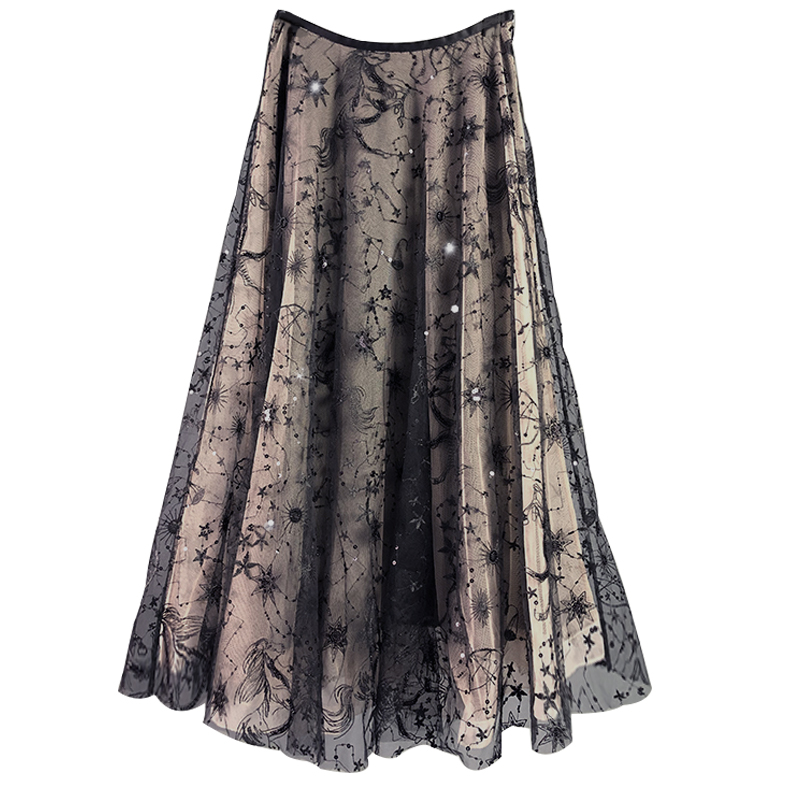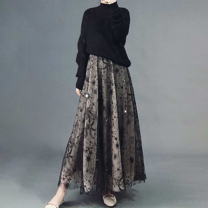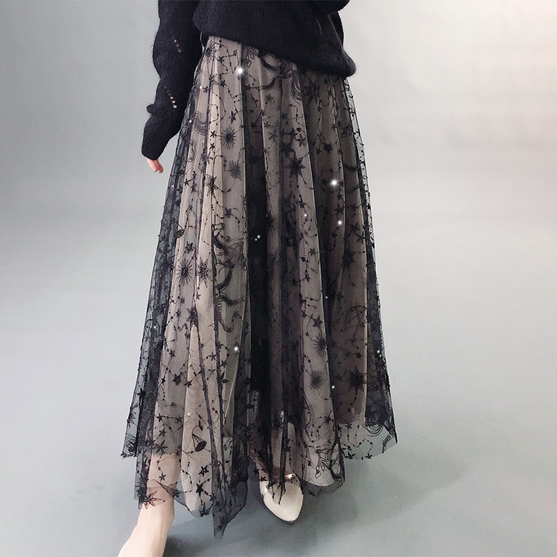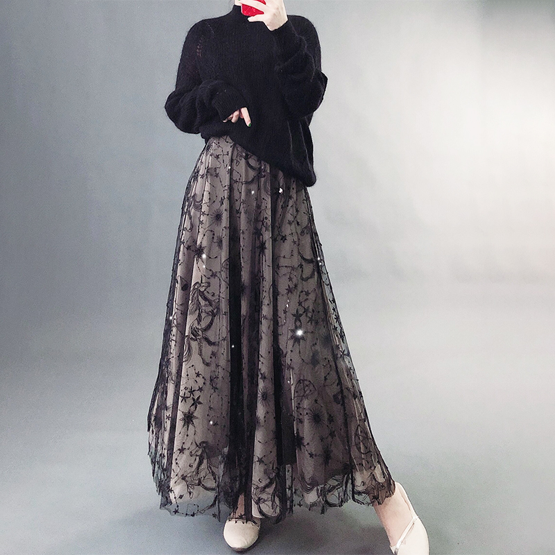 星月蕾丝小黑裙秋冬新朦胧网纱裙飞马亮片刺绣半身裙中长款a字裙
