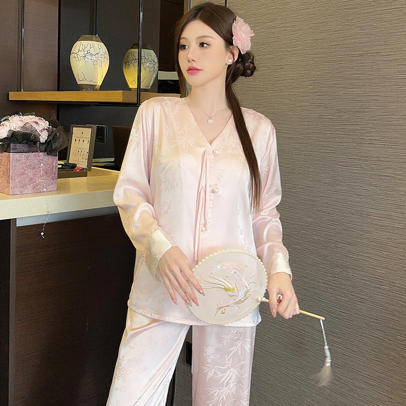 维多利亚轻奢新中式睡衣套装女士2025新款国风真丝亲肤印花家居服