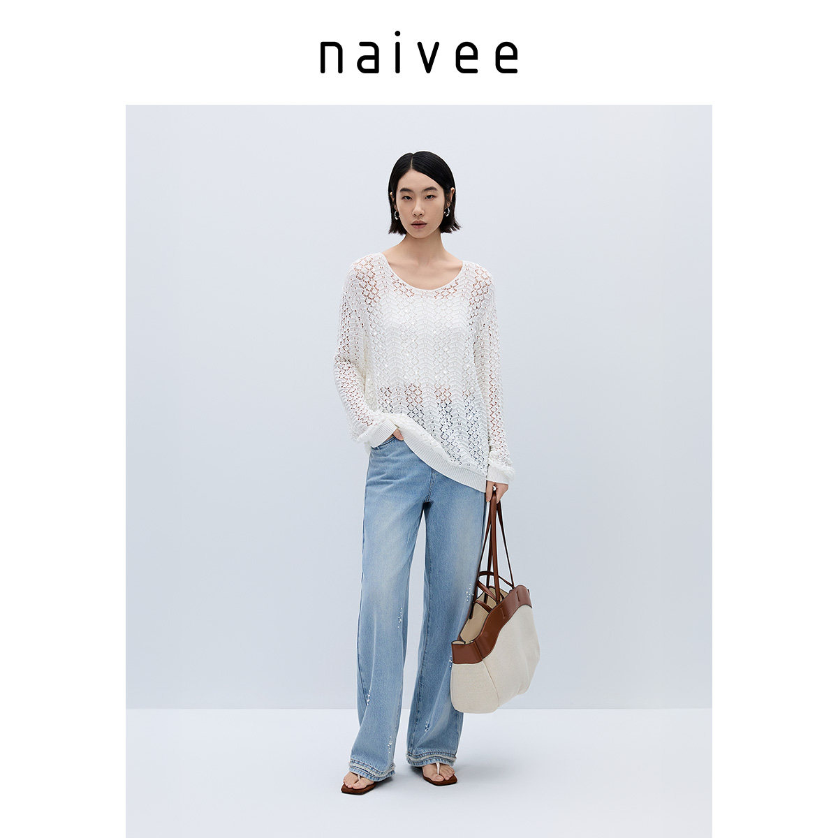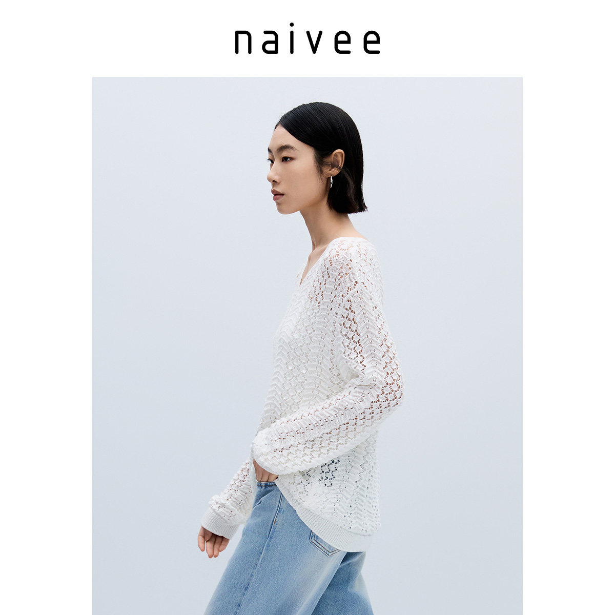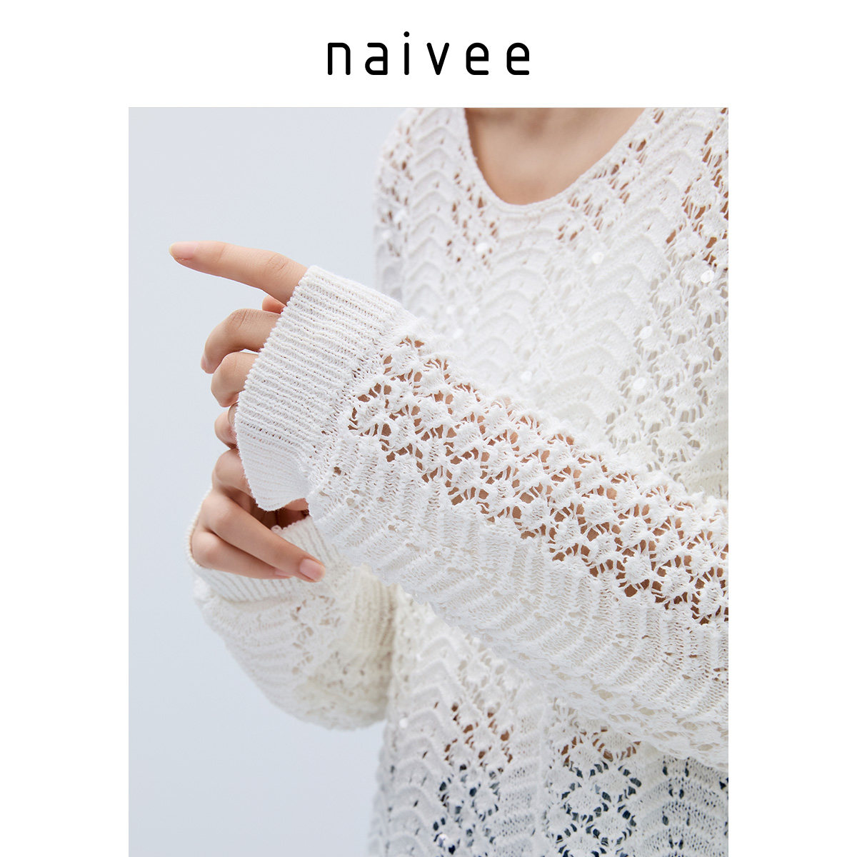 naivee纳薇25秋秋白色镂空棉针织罩衫女慵懒风钉珠刺绣套头毛衣