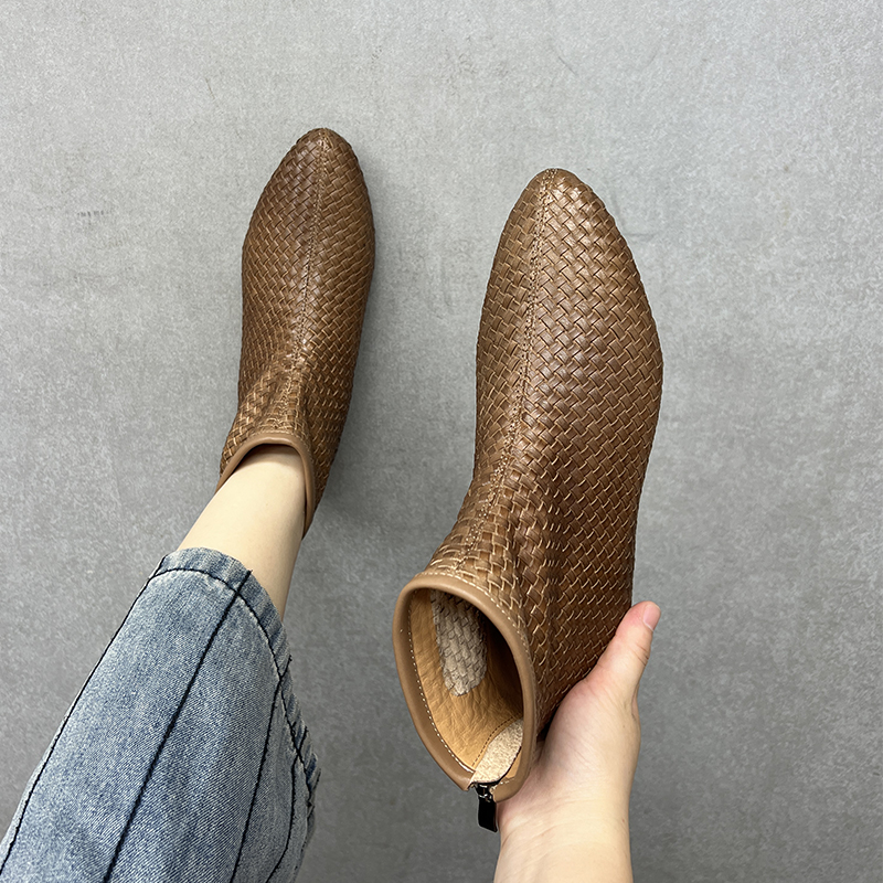 艺鞜2025年秋季新款真皮平底编织高端休闲拼接尖头后拉链软底短靴