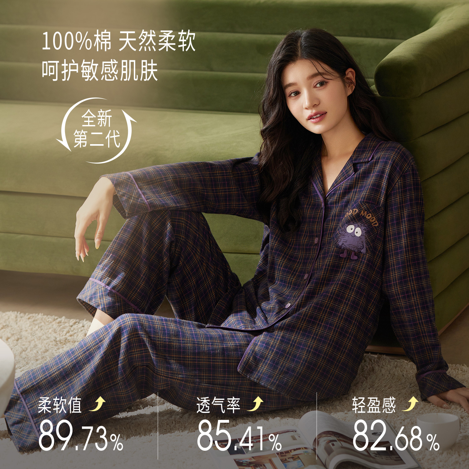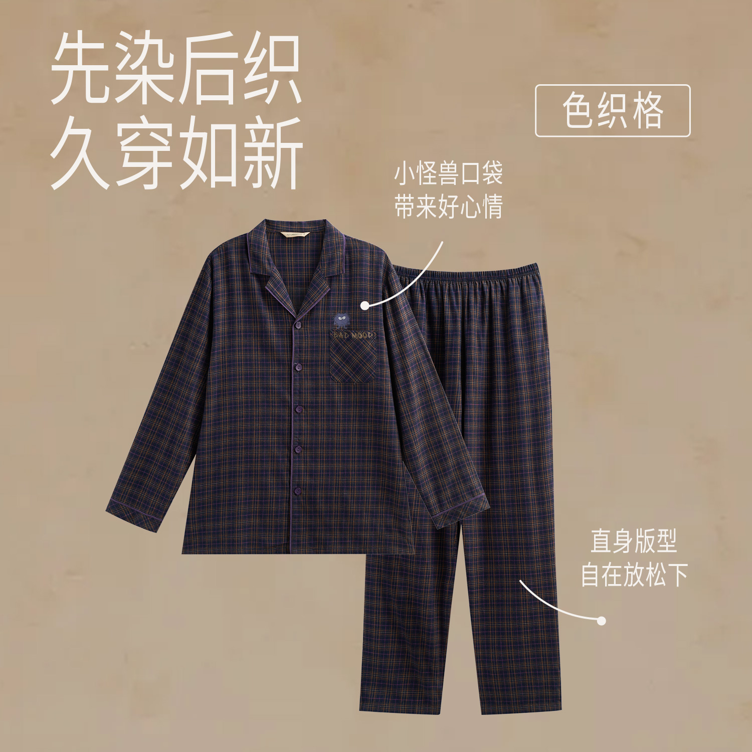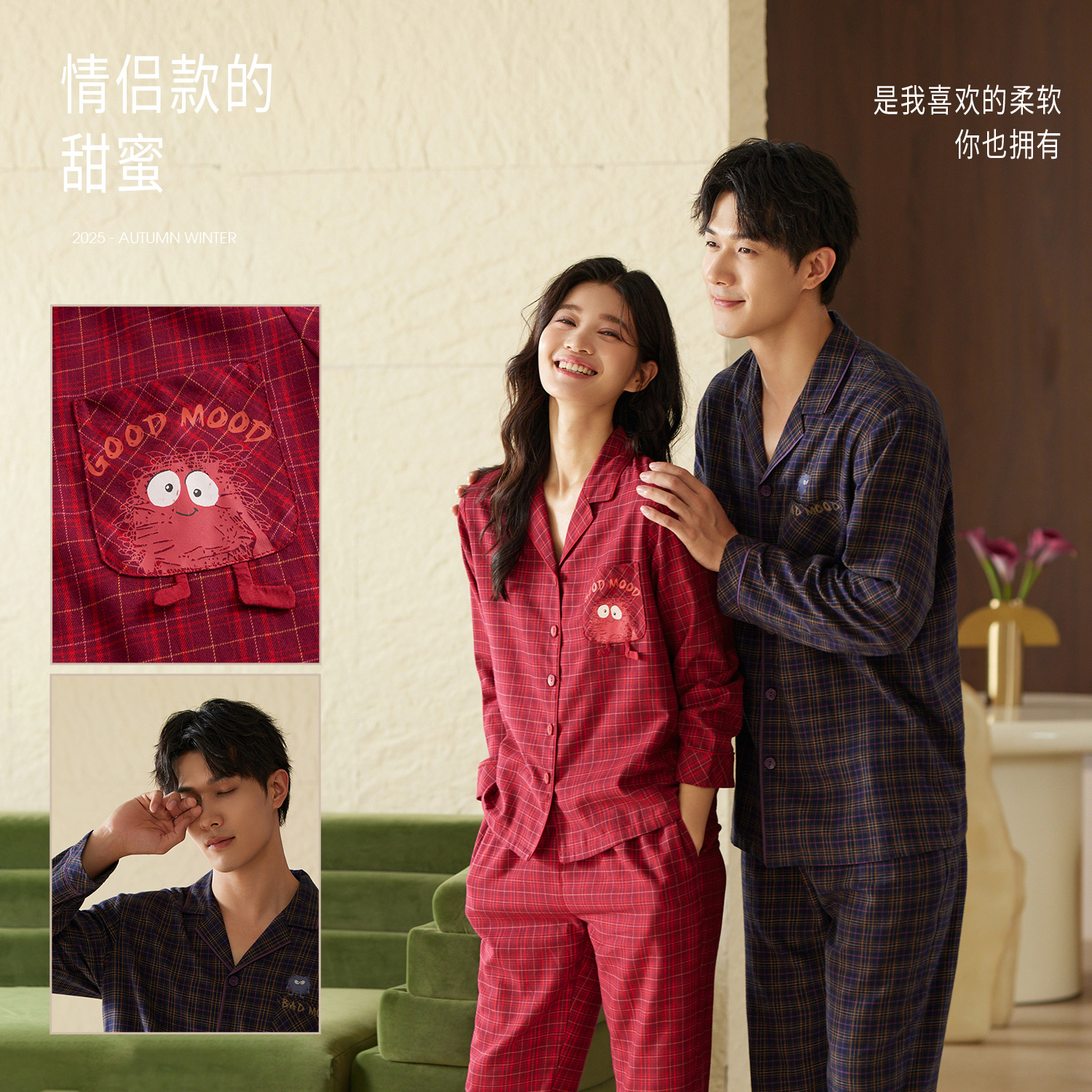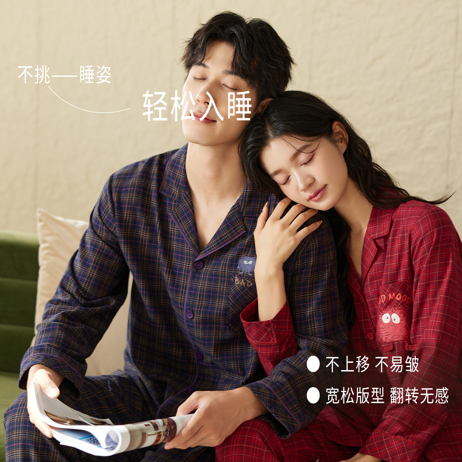 秋鹿柔软梭织色织格纯棉男女睡衣