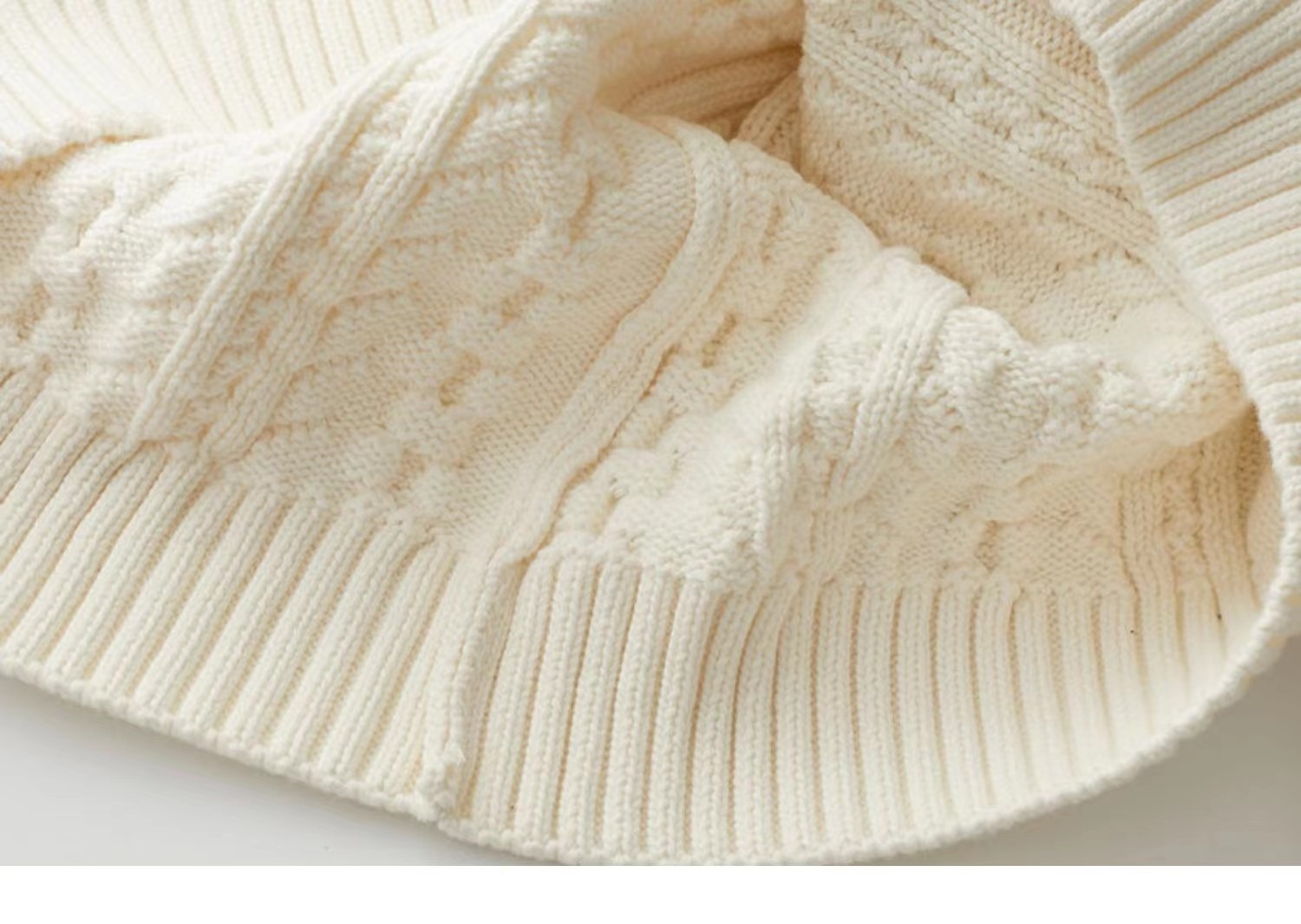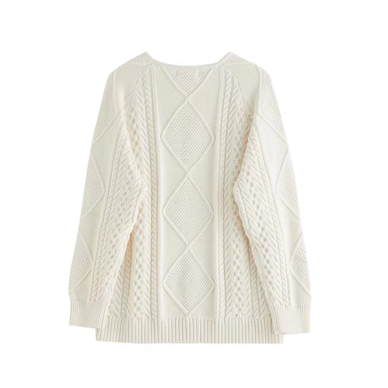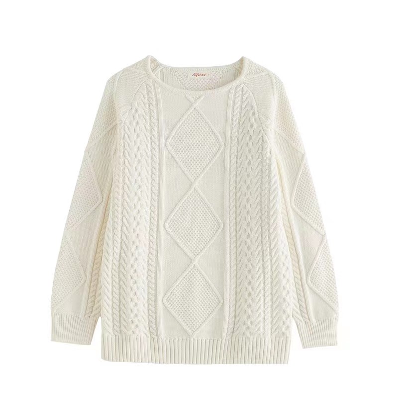 纯棉毛衣女圆领全棉白色针织宽松外穿绞花线衣100棉加厚中长款冬