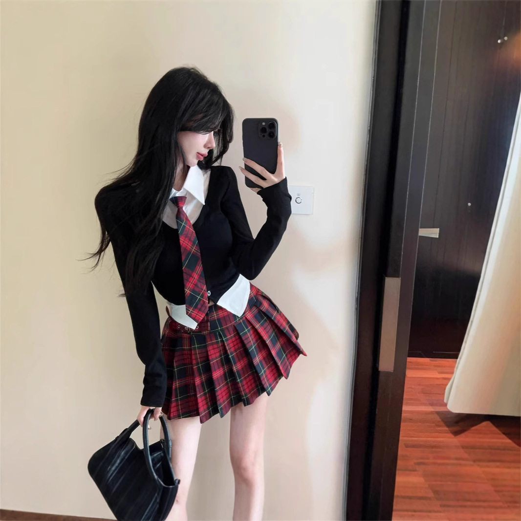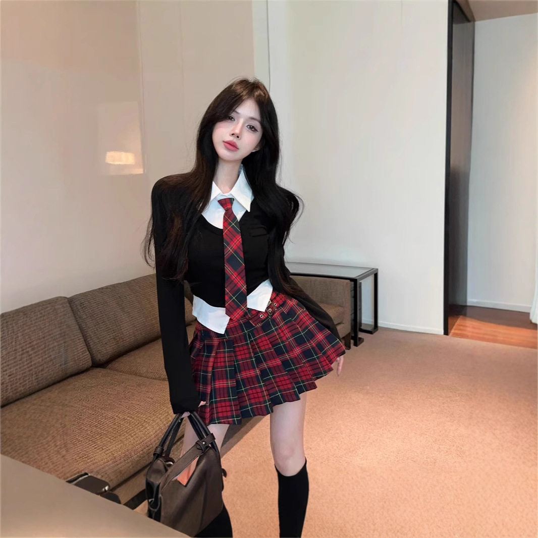 学院风制服套装辣妹假两件polo领短上衣高腰jk格子裤裙职业套装