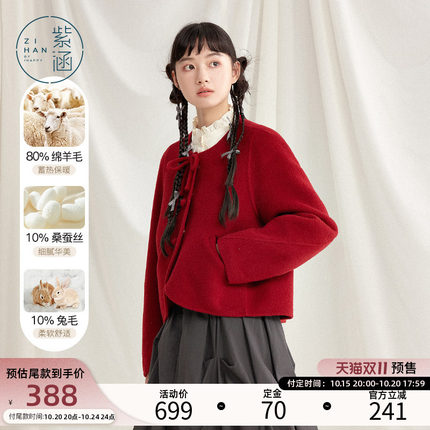 紫涵短款圆领蝴蝶结毛呢大衣女春秋季新款甜美休闲简约气质短外套