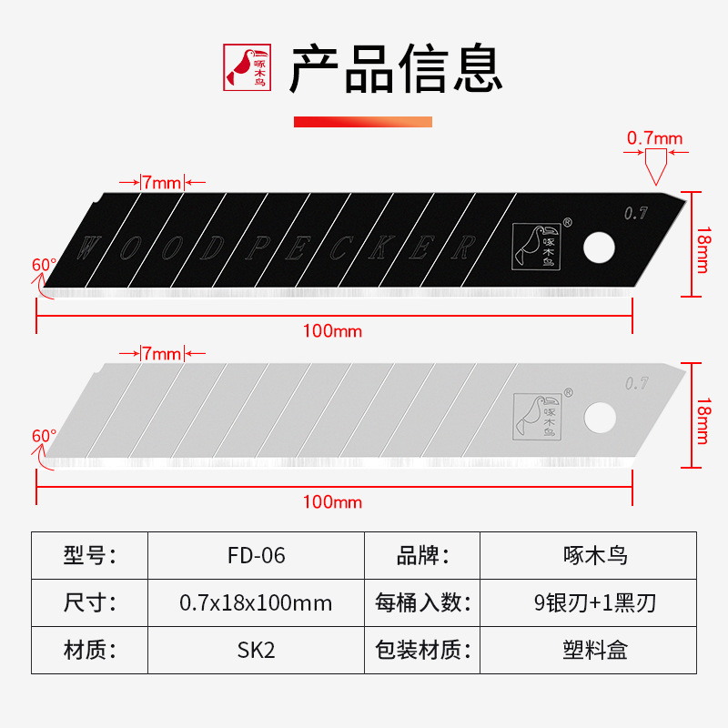 啄木鸟美工刀片FD-06加厚0.7mm宽度18mm100片壁纸刀片锋利耐用刀