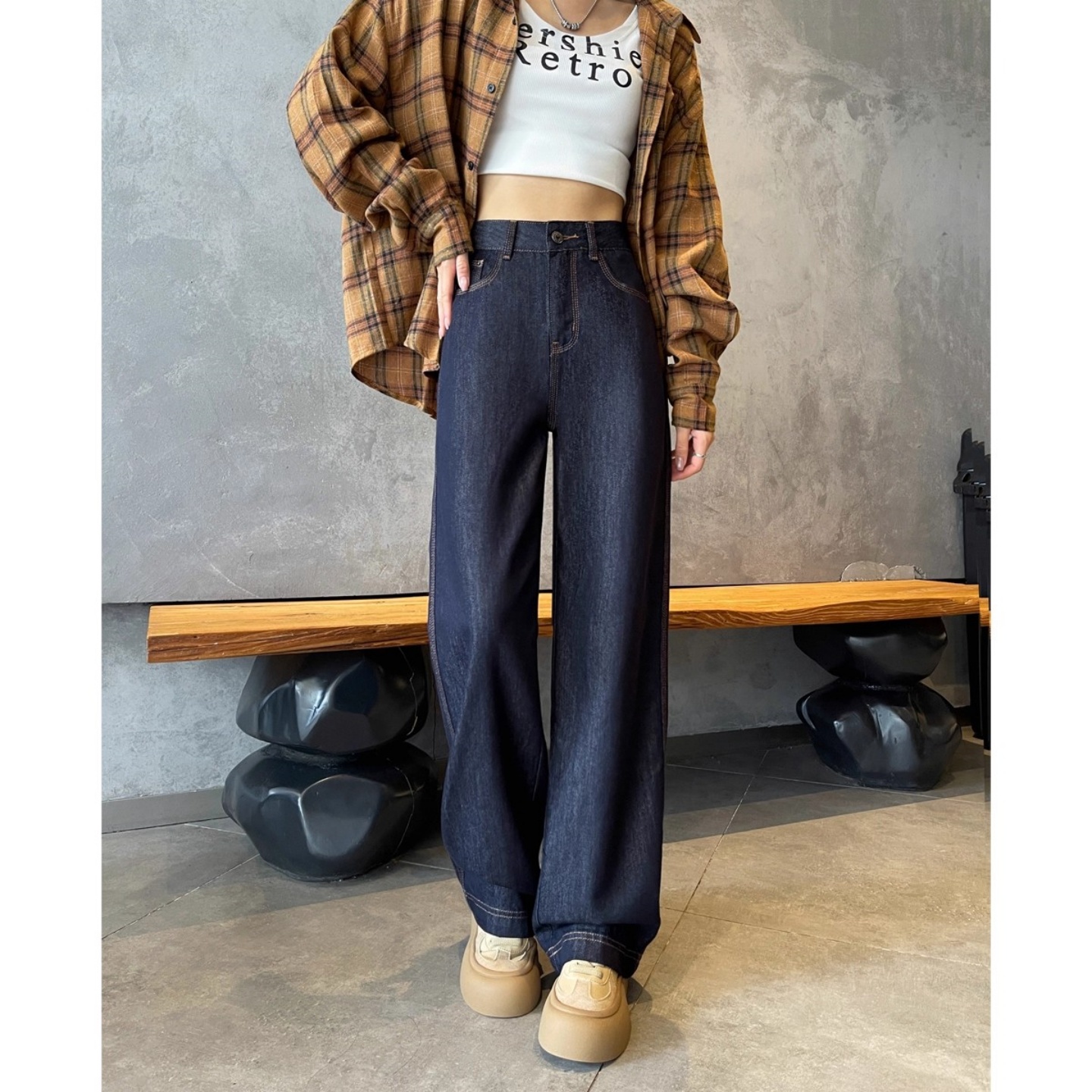 深蓝色高腰直筒牛仔裤女春秋2025新款粗腿宽胯显瘦宽松阔腿拖地裤