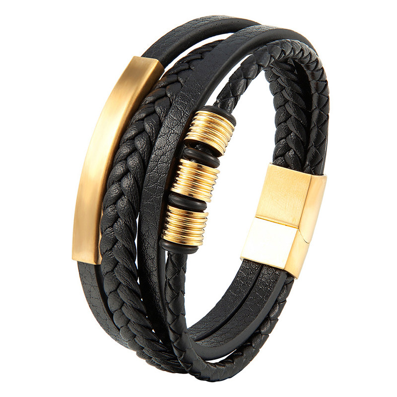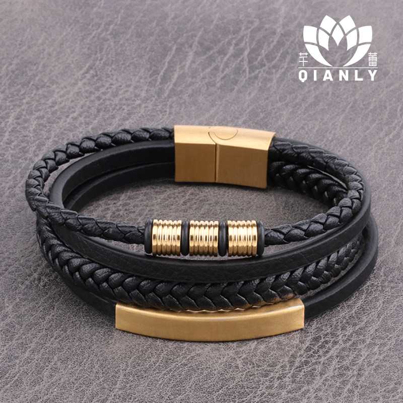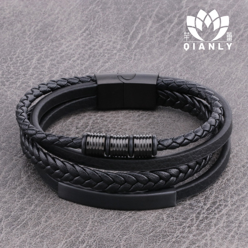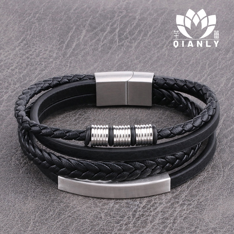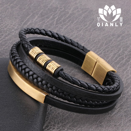 欧美钛钢不锈钢皮绳编织多圈真皮手环手带男士手镯牛皮圈手链男生
