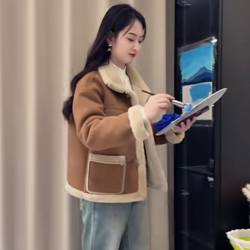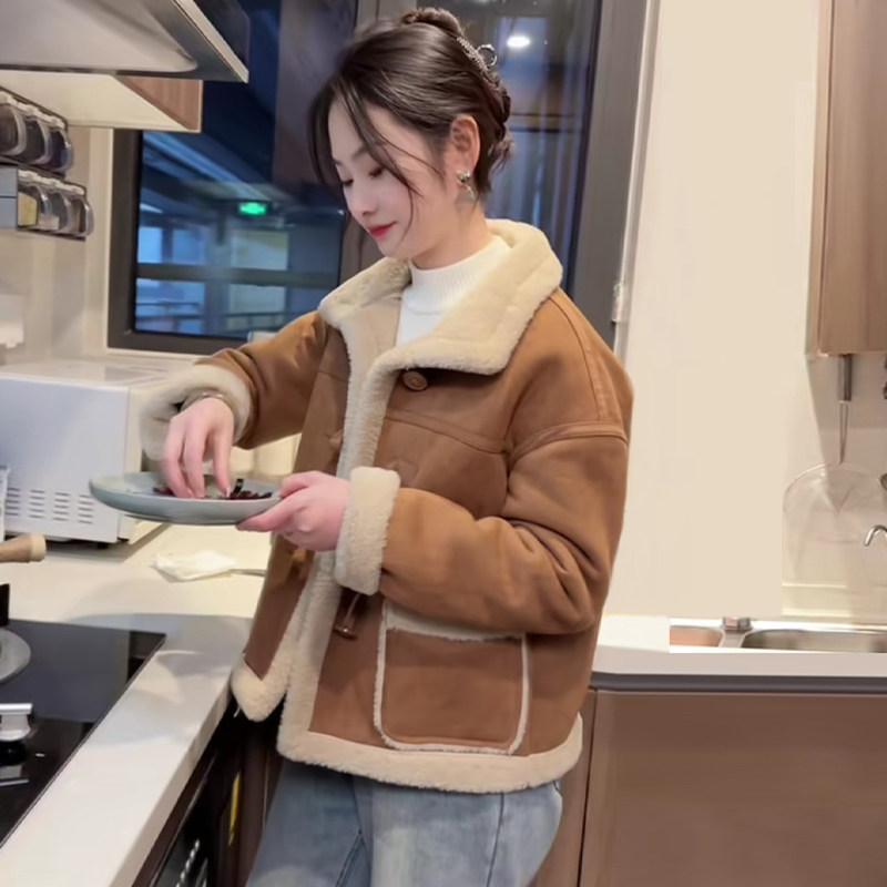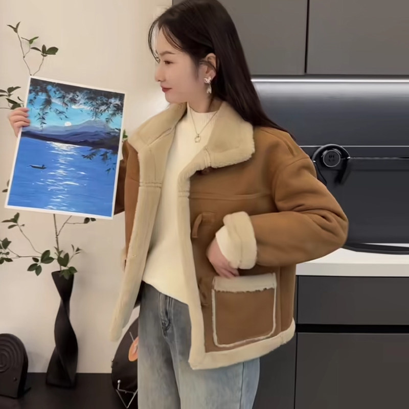 欧货新韩版皮毛一体外套女宽松麂皮绒羊羔毛秋冬保暖长袖外套上衣