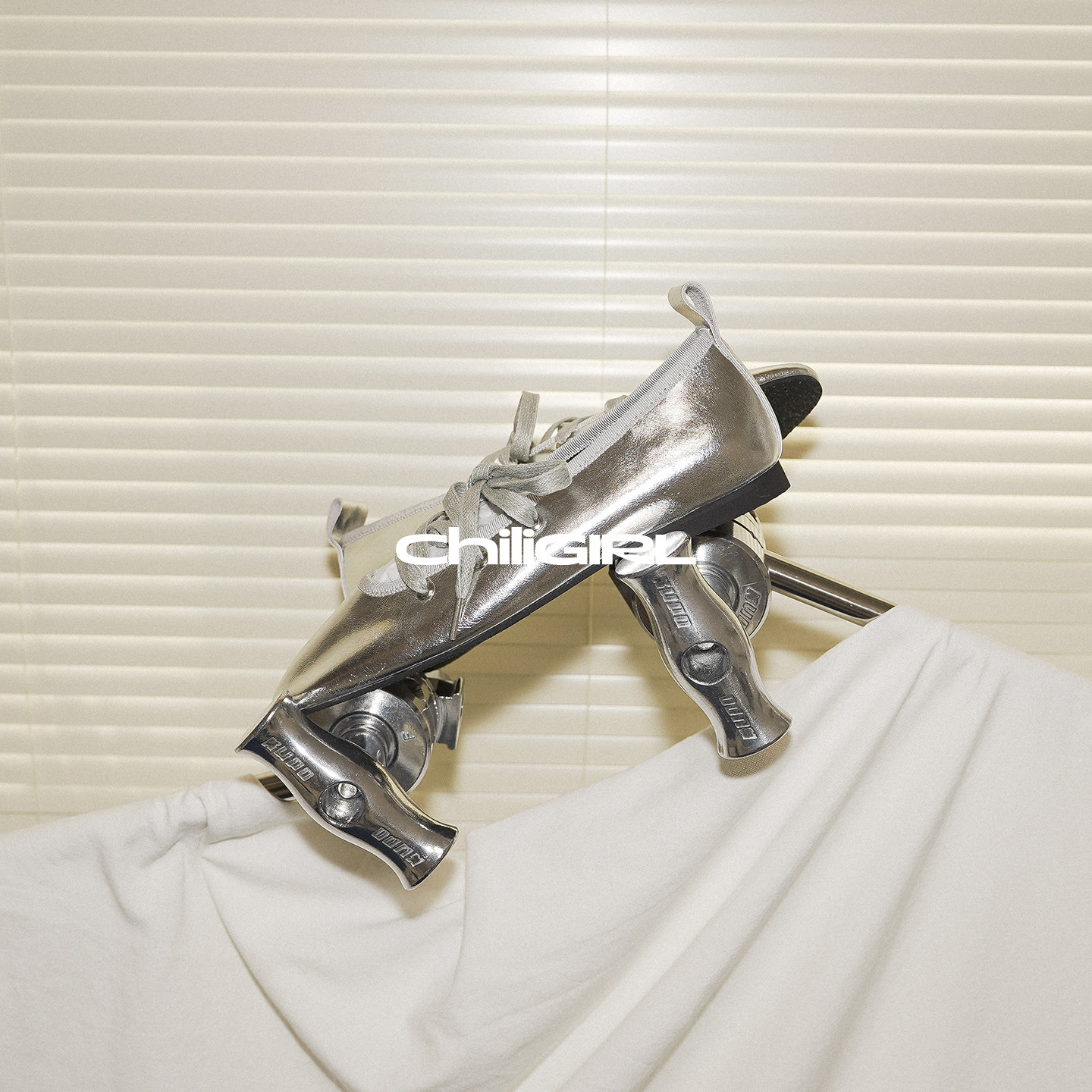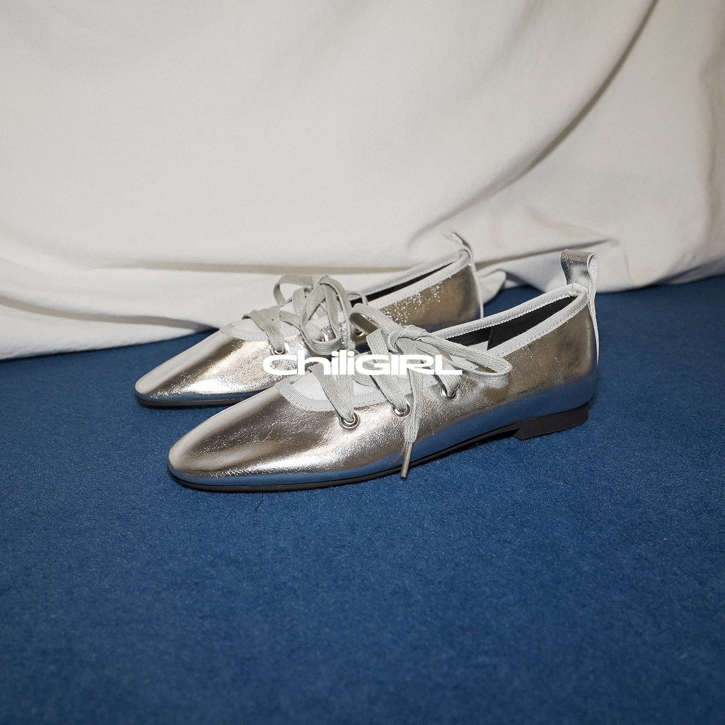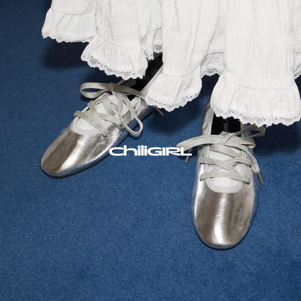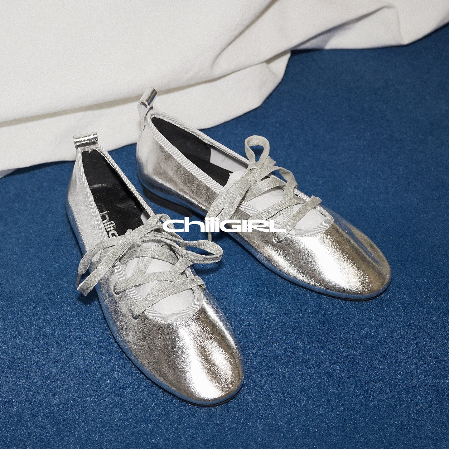 CHILIGIRL 浅口系带玛丽珍鞋 银色超美绑带芭蕾单鞋不累脚平底鞋