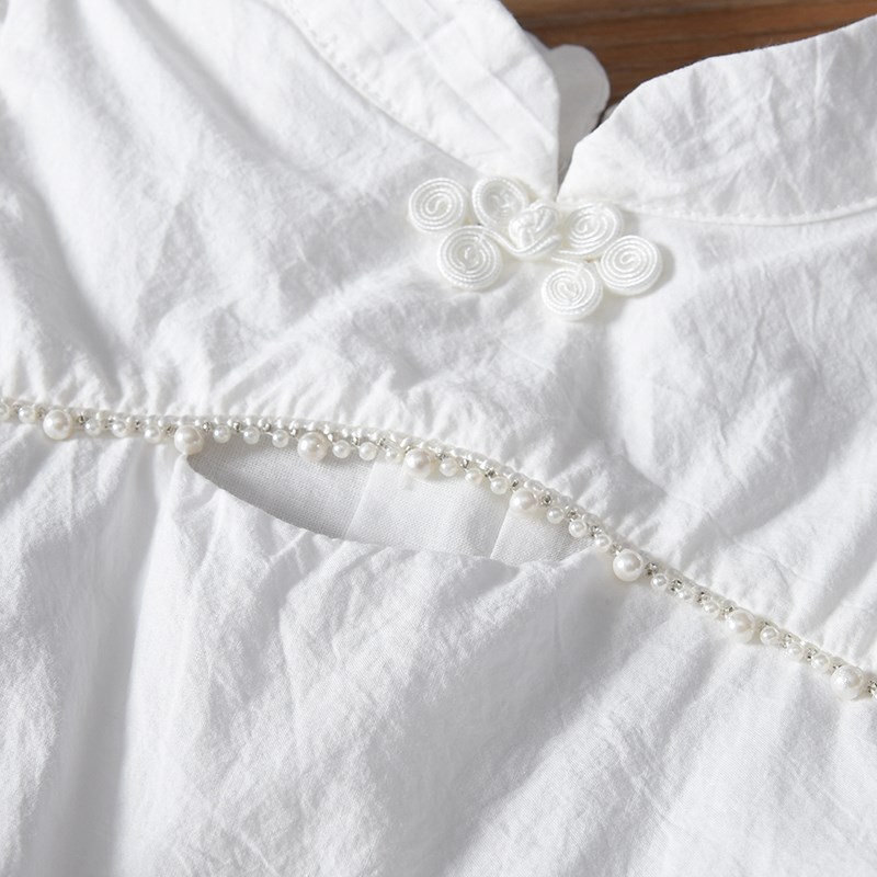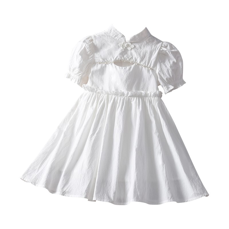 女童古装汉服连衣裙夏季女宝宝中国风镂空钉珠短袖古风白色旗袍裙