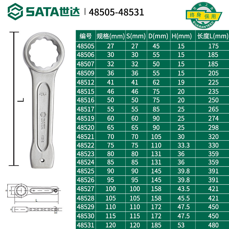 世达重型敲击梅花扳手直柄单头开口加厚打击工业级超硬大扳手55