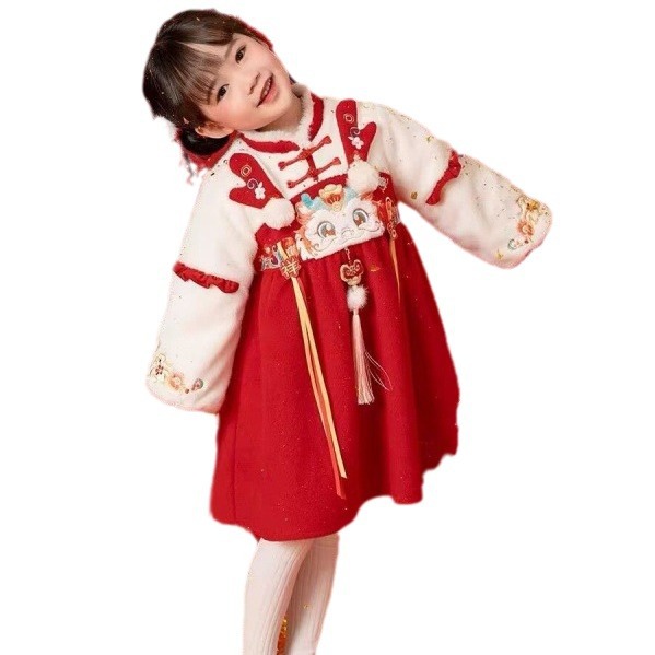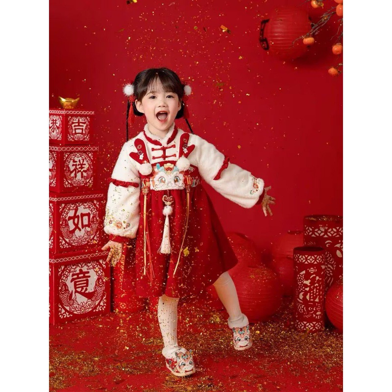汉服女童春装宝宝喜庆红色连衣裙小女孩装萌龙唐装国风古装加绒