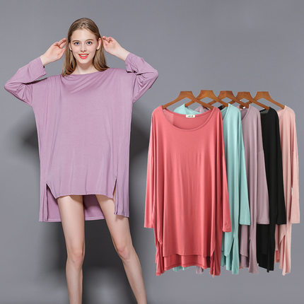 春秋莫代尔长袖睡裙女士薄连衣裙打底弹力宽松大码孕妇休闲起居服