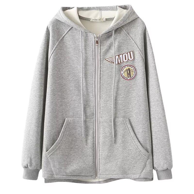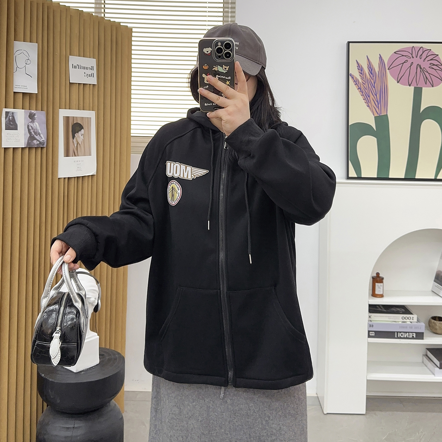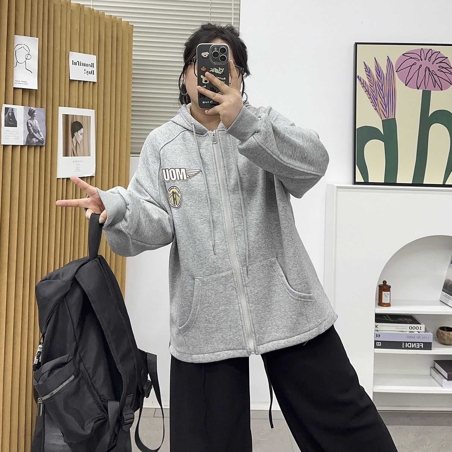 大码拉链连帽加绒卫衣外套2024年冬季新款宽松运动休闲开衫上衣女