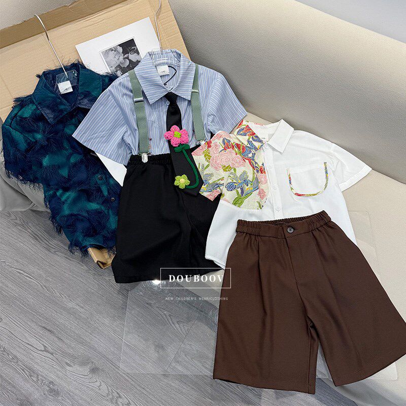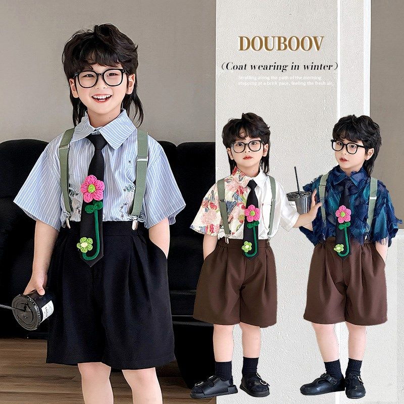 儿童夏季短裤六一背带套装新w款男童学院风背带裤演出服宝宝礼服