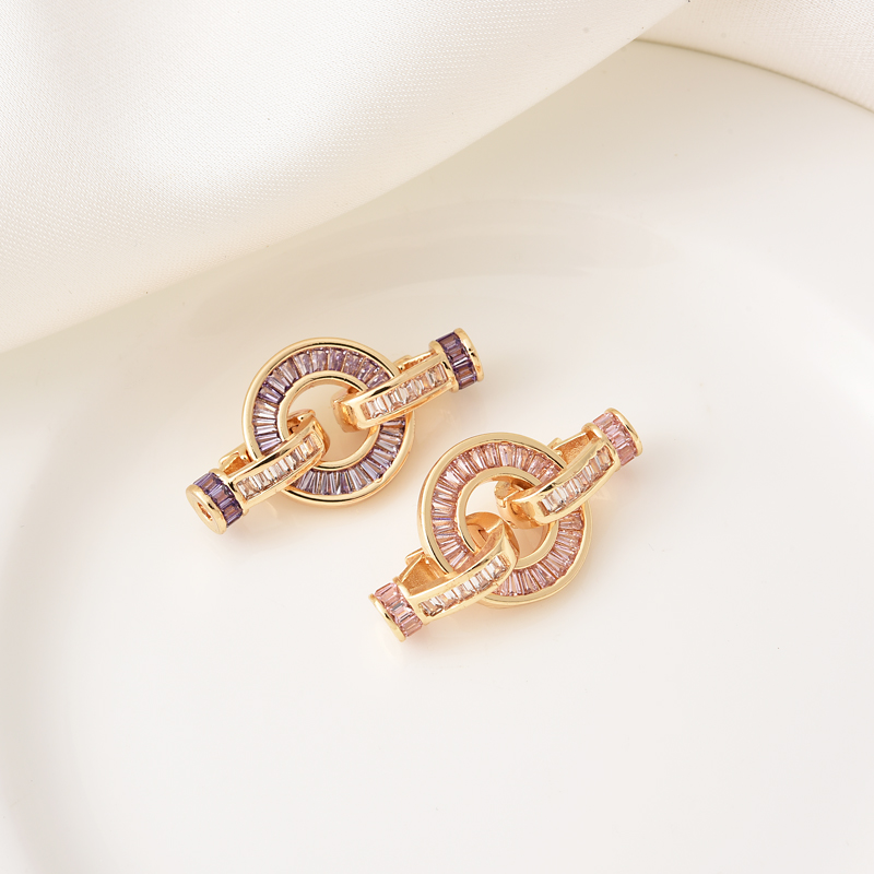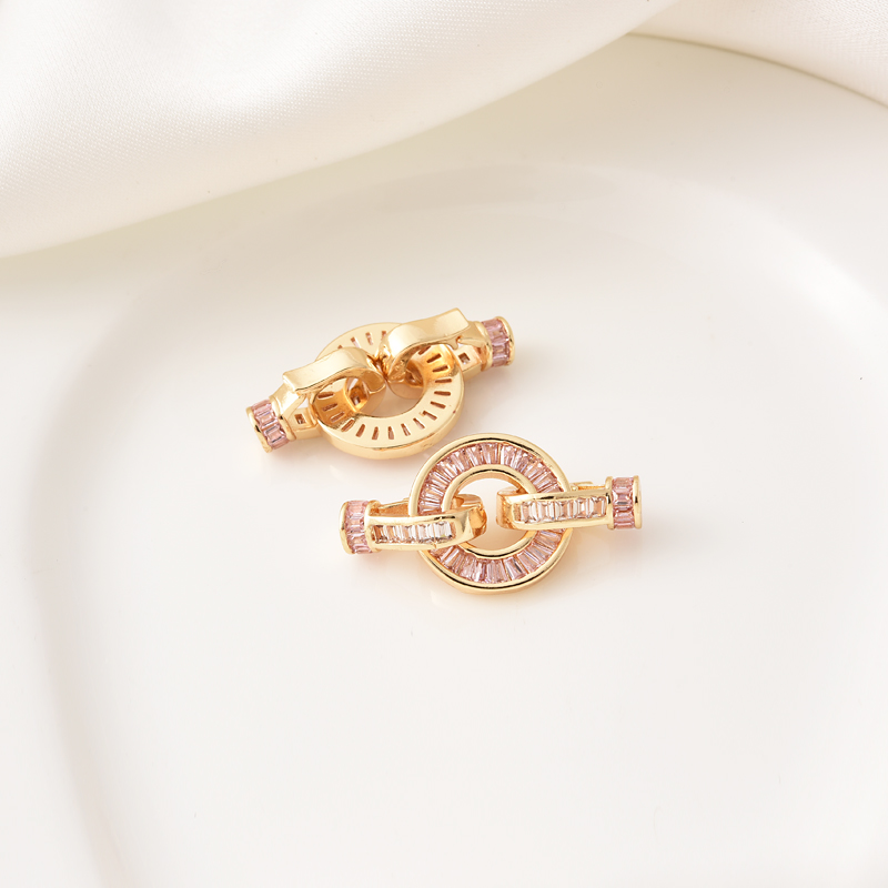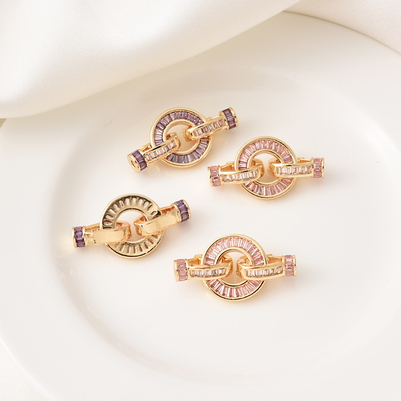 铜镀14K金镶粉锆圆盘珍珠扣手工diy手链项链收尾紫锆连接扣子母扣