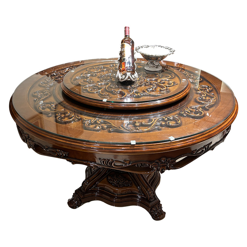 欧式全实木雕花圆形餐桌椅组合镂空雕花钢化玻璃美式奢华别墅家具