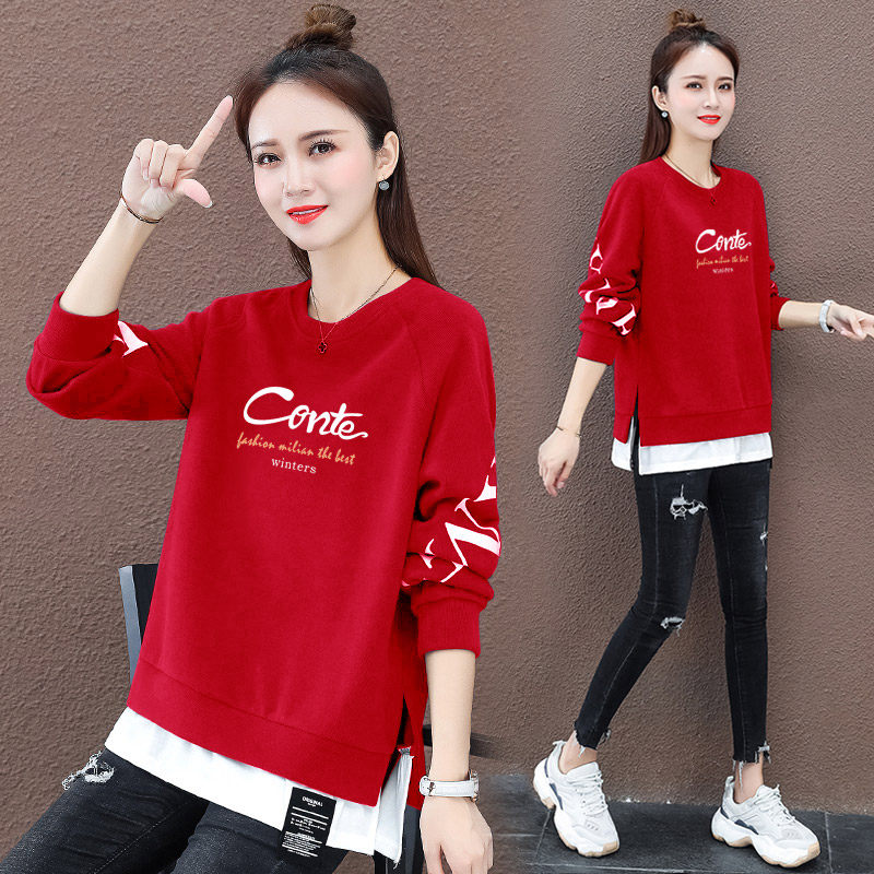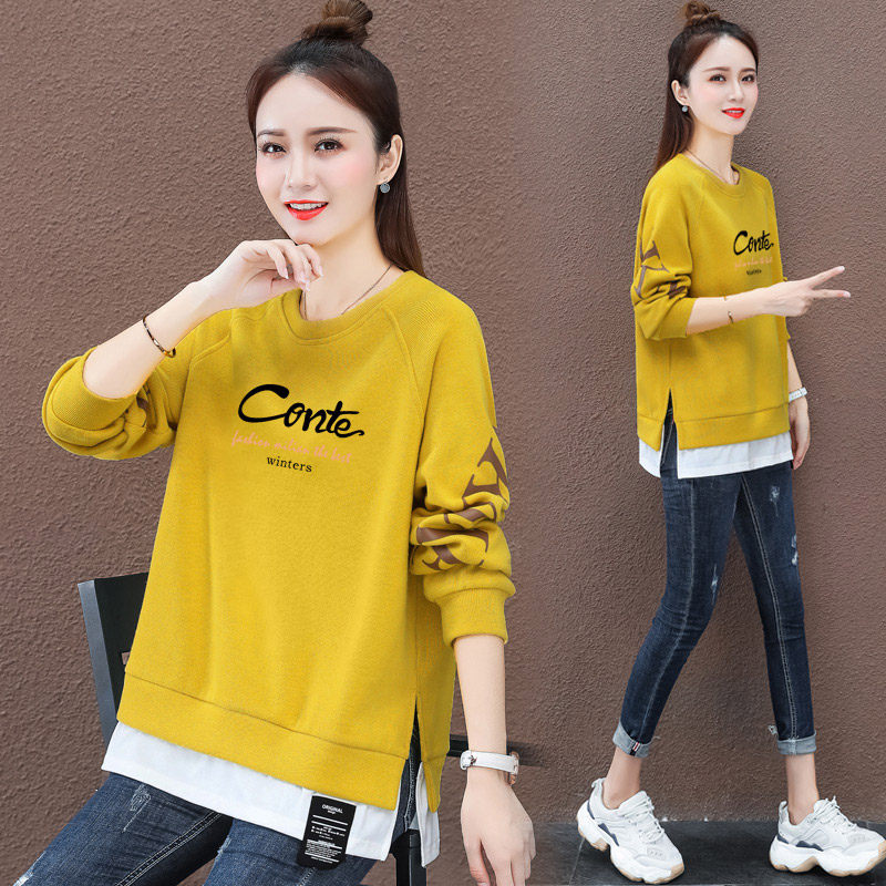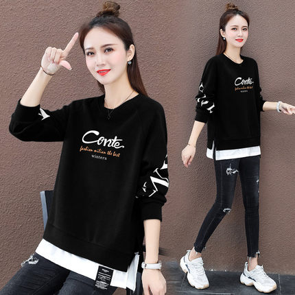 纯棉长袖卫衣女大码宽松秋冬季新款洋气减龄加绒假两件外套上衣潮