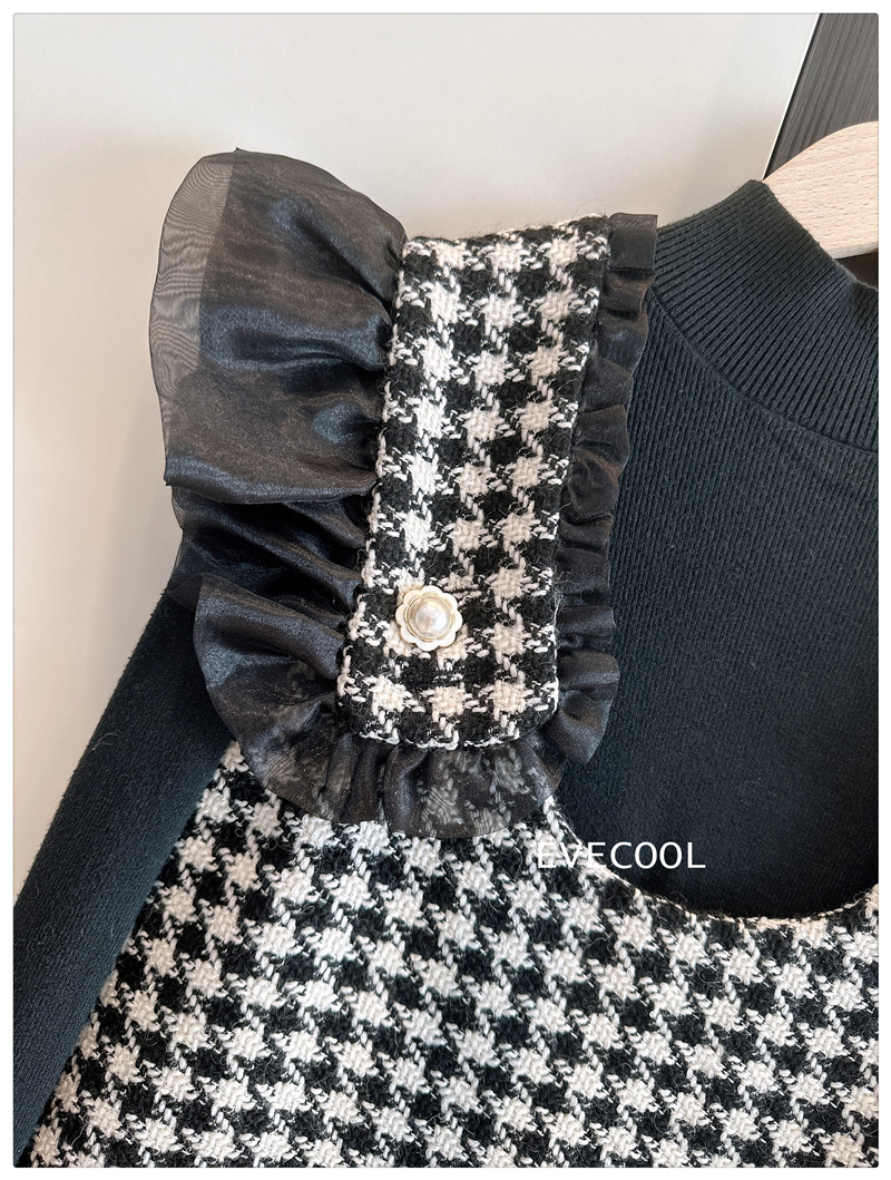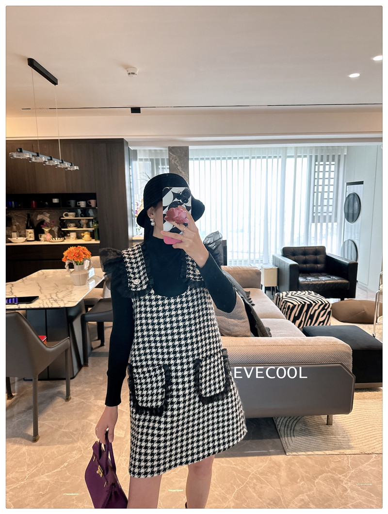 韩版新款宽松直筒千鸟格背心拼欧根纱连衣裙短裙小香风百搭打底裙