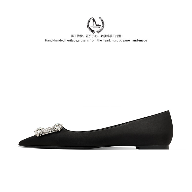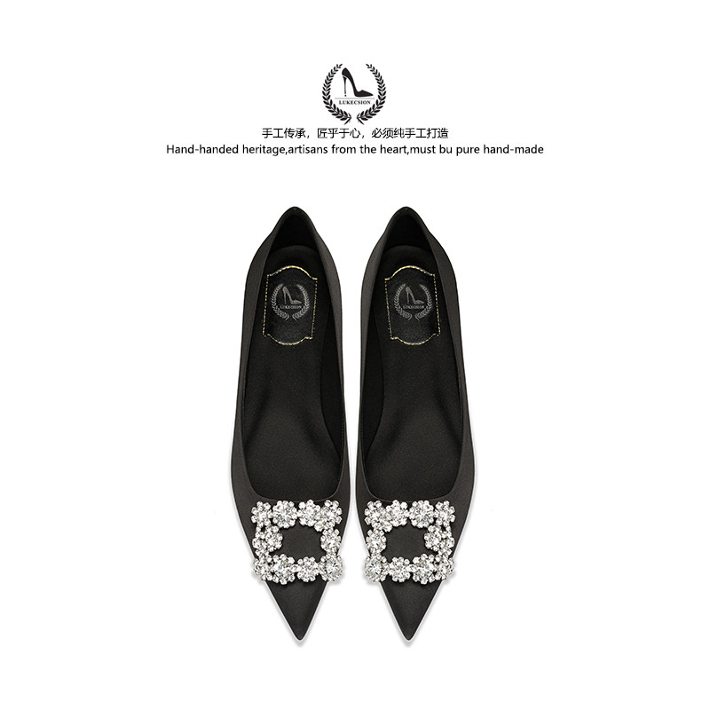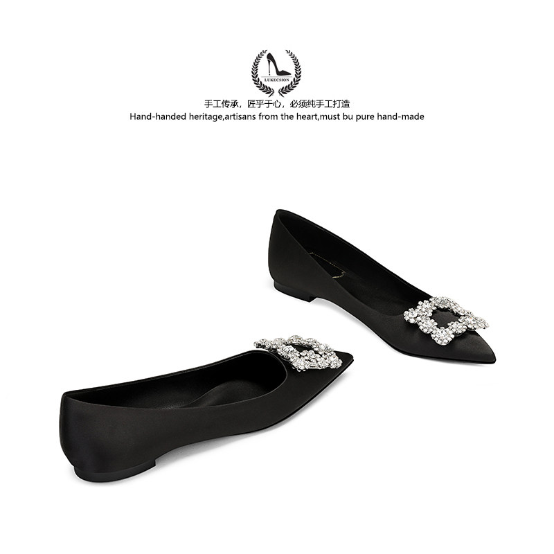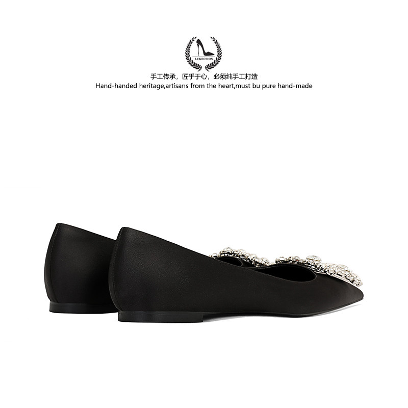 LUKE气质水钻方扣黑色平底鞋女夏新款浅口尖头通勤透气舒适单鞋