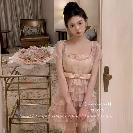 YETINGXI 落樱/古早千金感蛋糕连衣裙日系假两件甜美蝴蝶结短裙粉