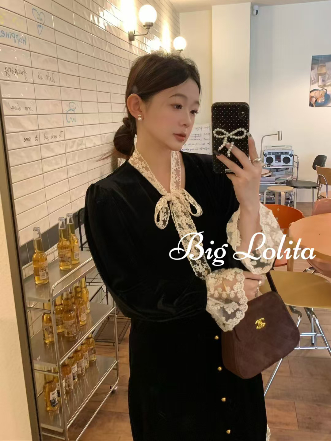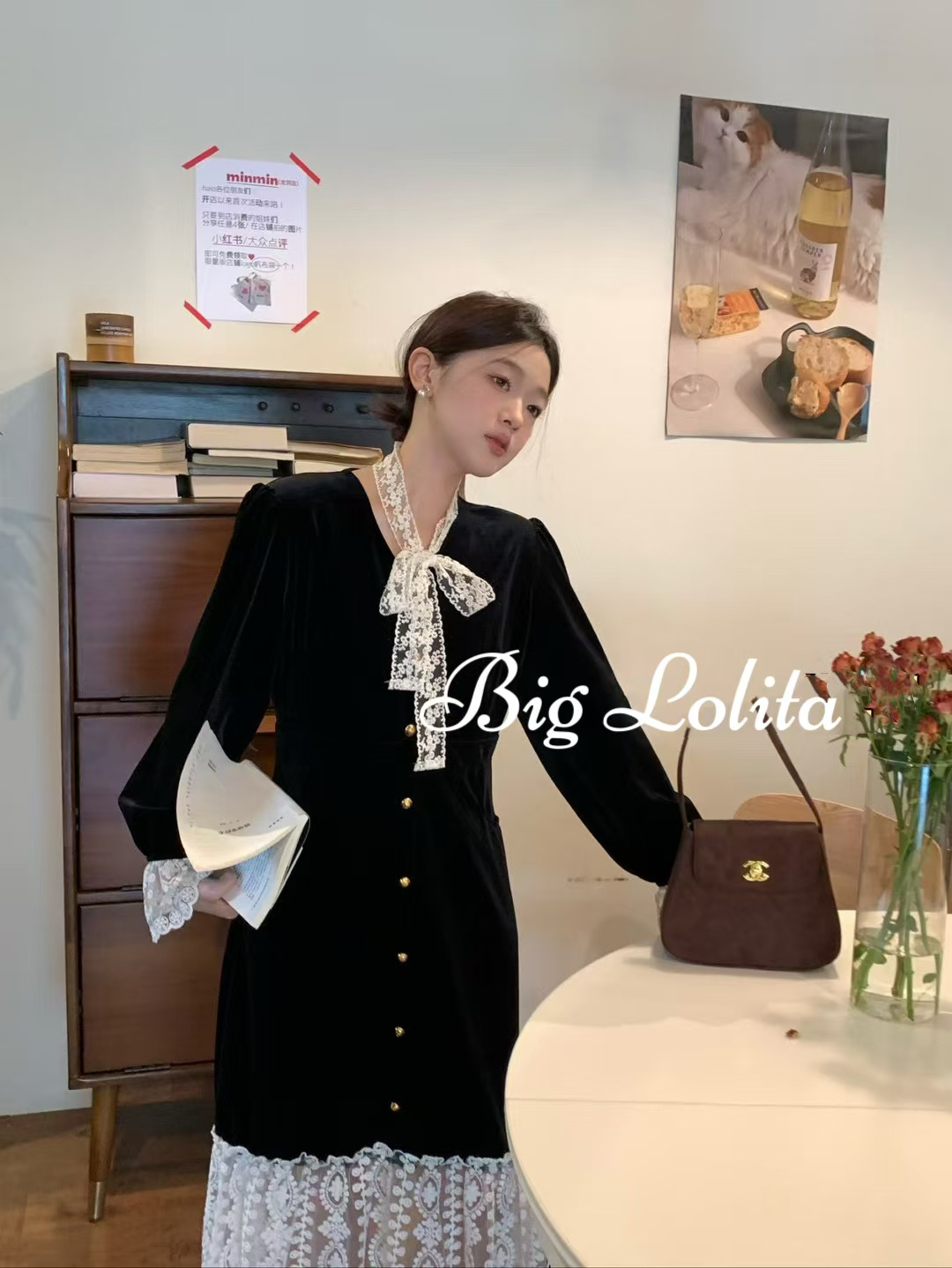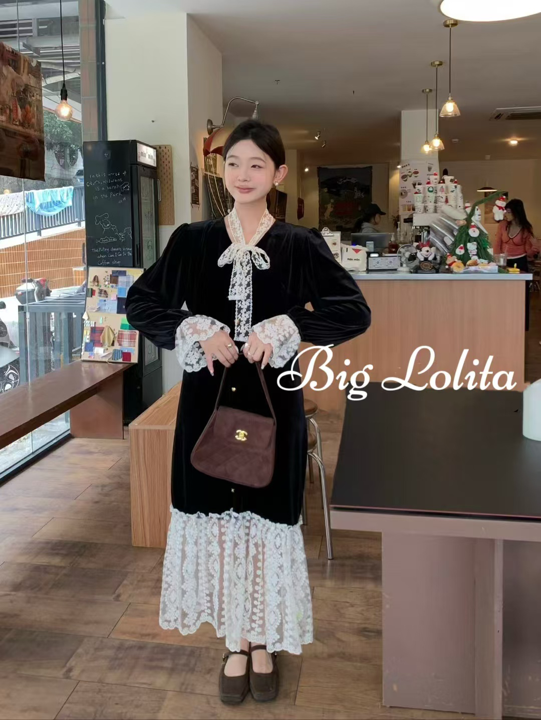 【玛德琳】大萝莉大码丝绒连衣裙女秋冬蕾丝胖MM年会显瘦长袖裙