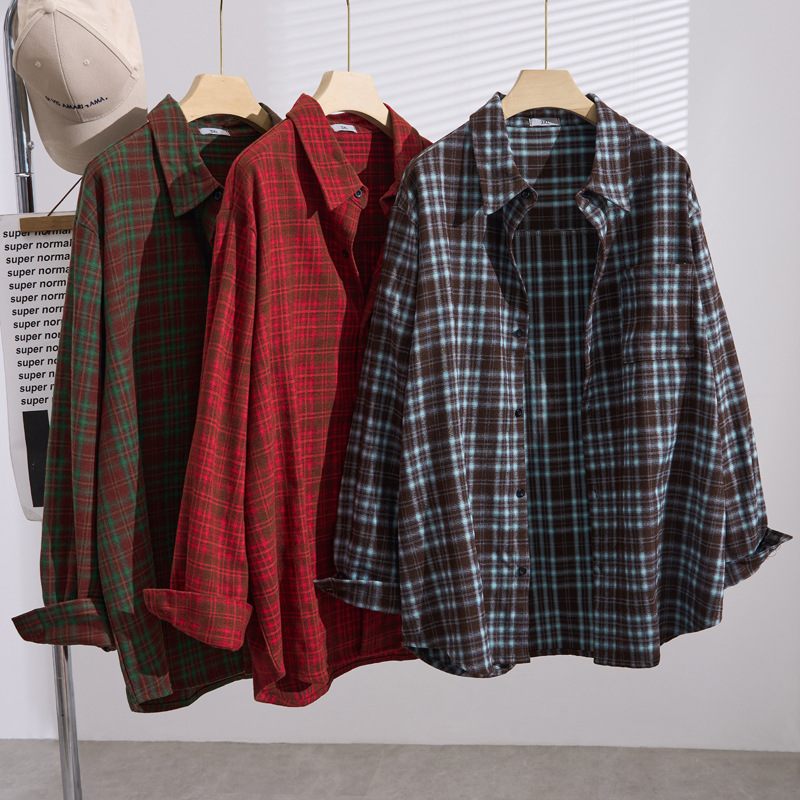 特大码女装300斤胖MM秋显瘦宽松磨毛慵懒风长袖上衣格子衬衫外套