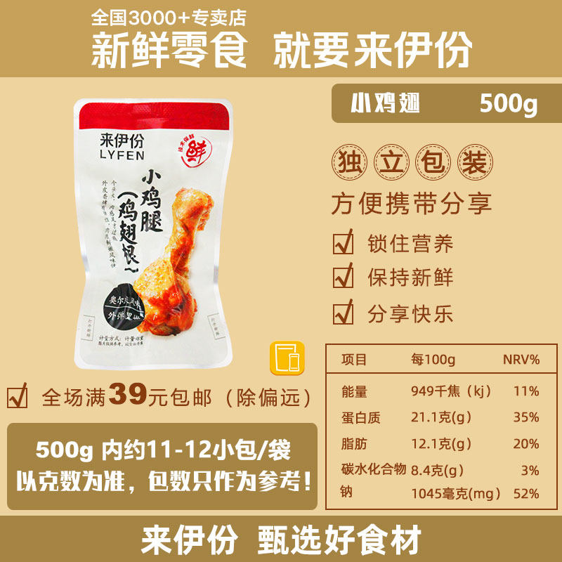 来伊份小鸡腿(鸡翅根)500g奥尔良风味烤翅熟即食办公解馋零食