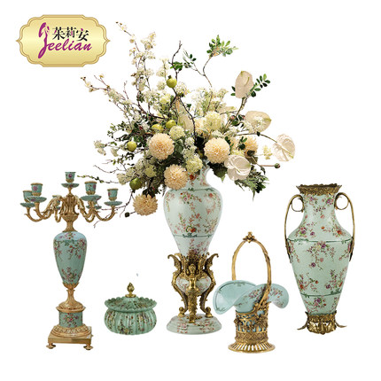 茱莉安法式精美陶瓷镶铜桌面装饰盒别墅欧式复古盖盒绿色花瓶摆件