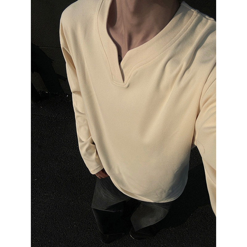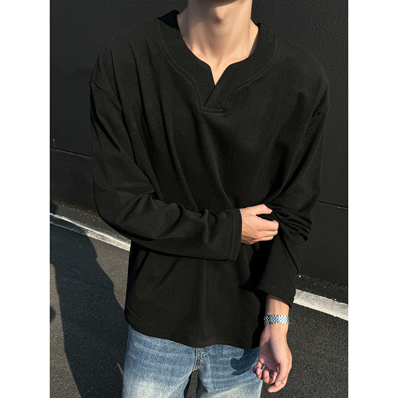 德绒黑色长袖t恤男秋冬季美式重磅V领卫衣cleanfit无帽内搭打底衫