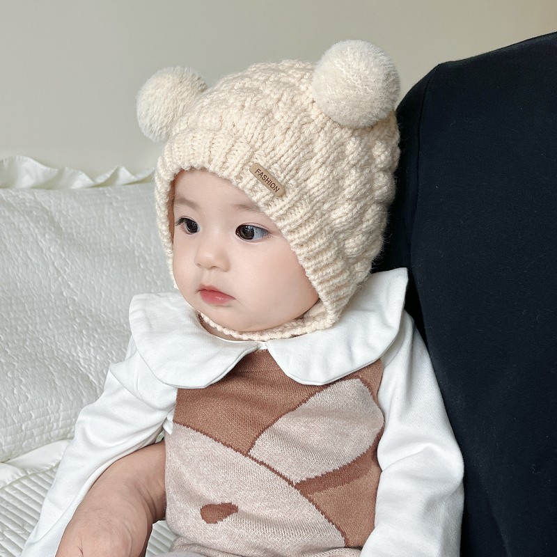 婴儿帽子秋冬季纯棉可爱宝宝双球护耳帽男女童冬天防风针织毛线帽