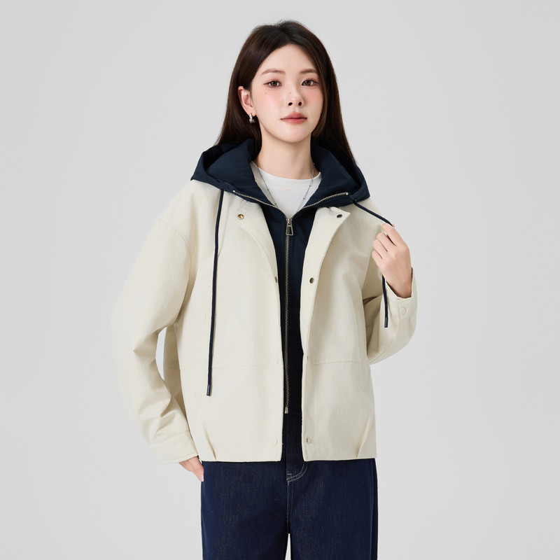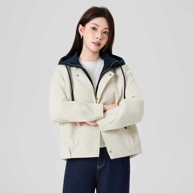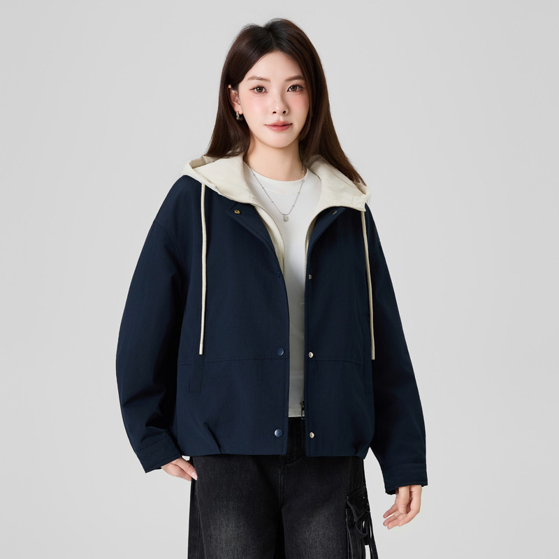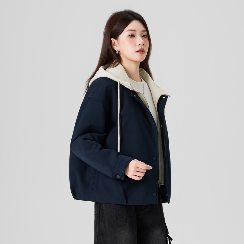 快鱼薄短款棉衣女2025年冬拼接领外套时尚假两件设计棉服连帽上衣