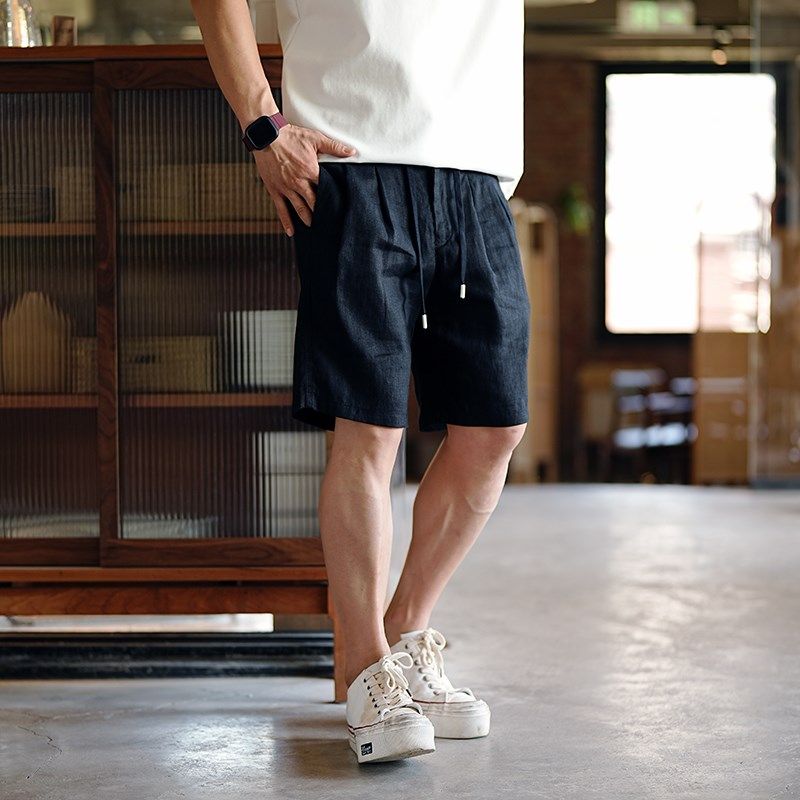 港风休闲极简设计轻薄透气亚麻短裤男夏季新款潮牌纯色抽绳五分裤