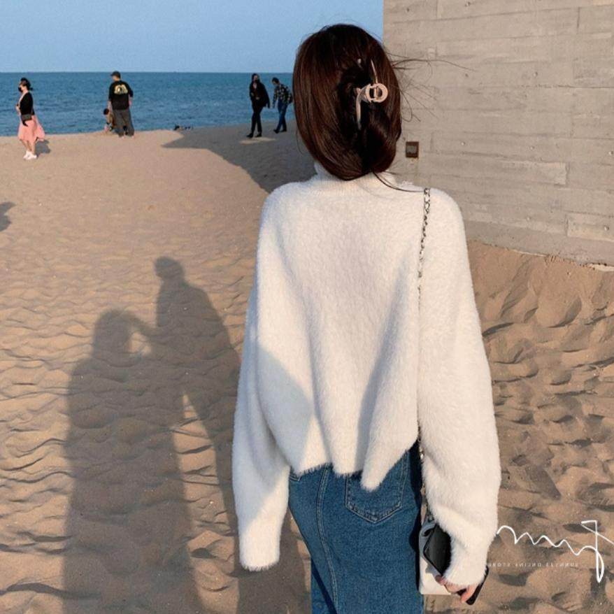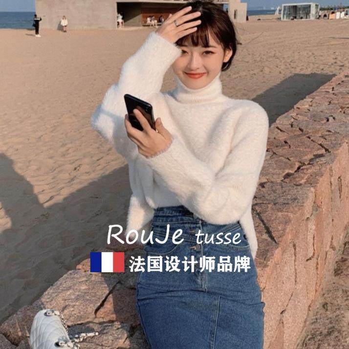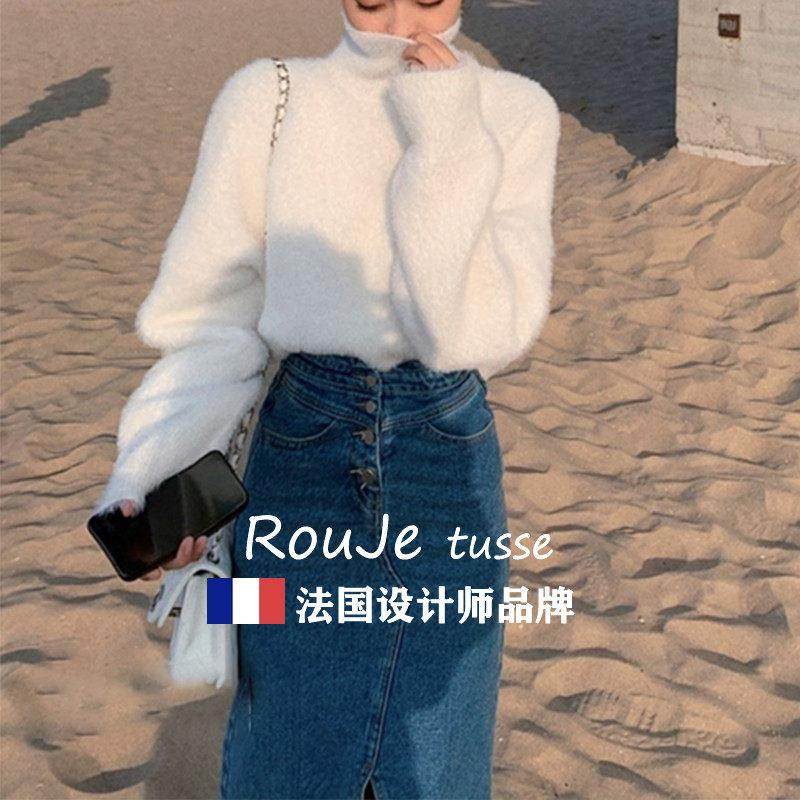 法国Rouje tusse白色高领套头水貂绒毛衣女加厚宽松慵懒针织上衣