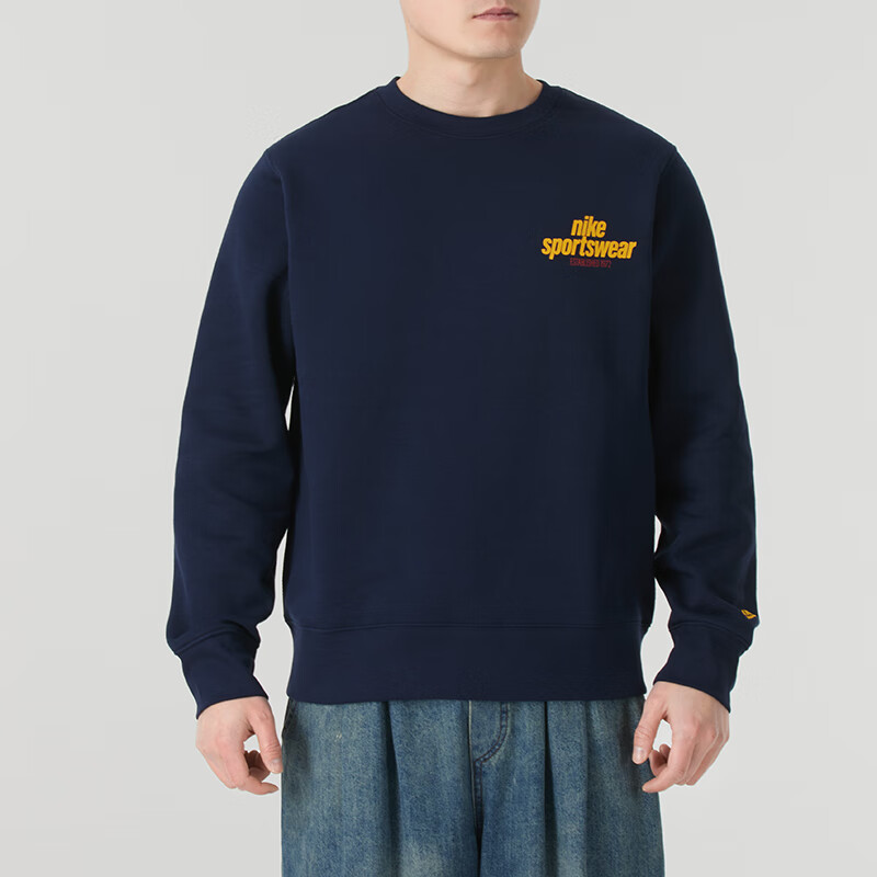 Nike耐克圆领加绒卫衣冬季新款保暖外套男子运动上衣藏蓝色套头衫