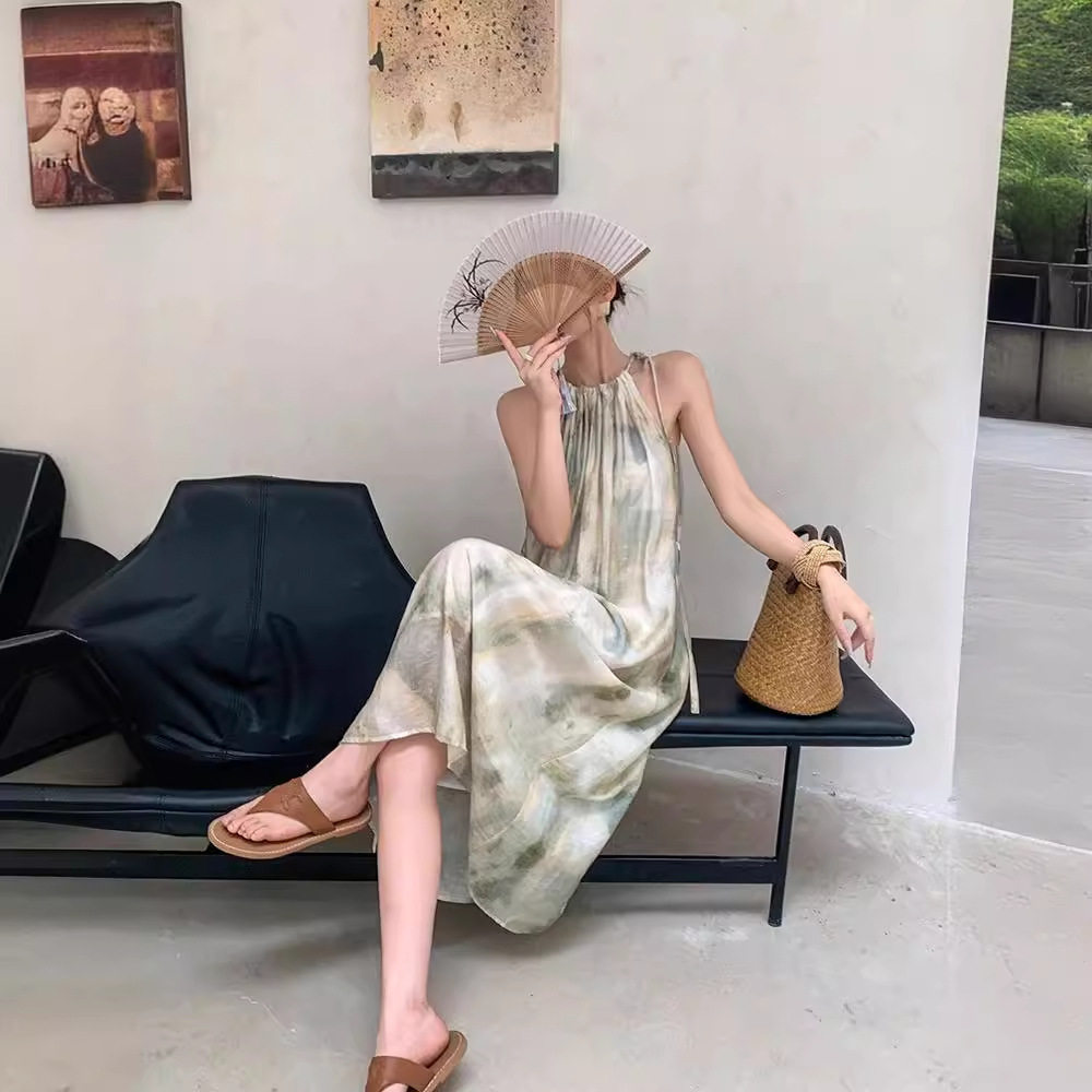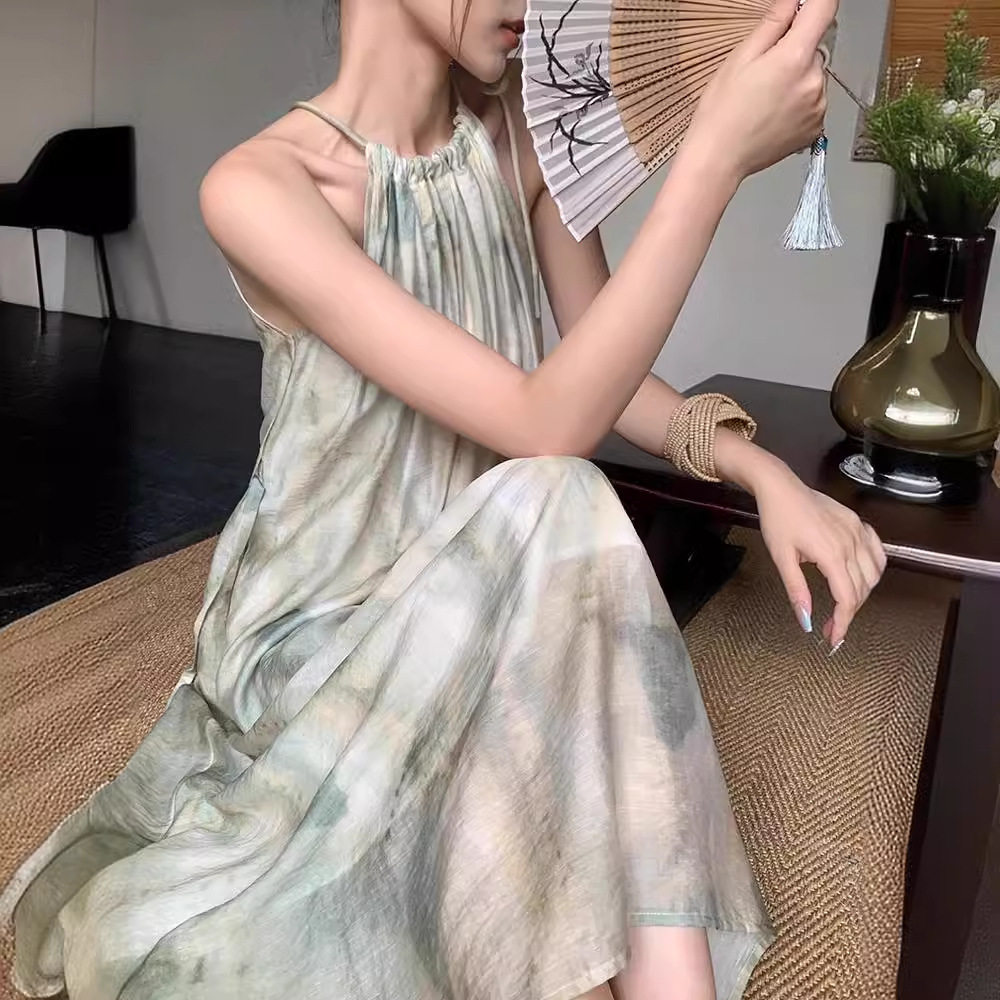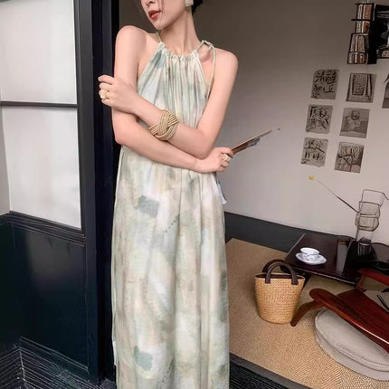 新中式无袖晕染挂脖连衣裙女夏季2024新款慵懒风气质显瘦度假长裙