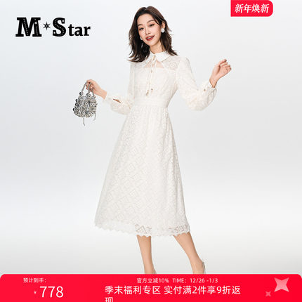 【2件9折】M STAR春季法式翻领蕾丝镂空长袖针织中长款连衣裙女