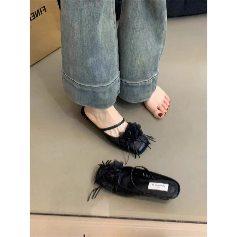 羊皮版!一字带花朵芭蕾舞软平底包头半拖鞋女外穿夏伴娘婚鞋坡跟