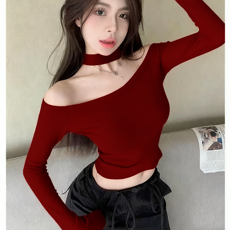 纯欲风一字领挂脖长袖t恤女早秋设计感小众辣妹修身打底衫上衣女