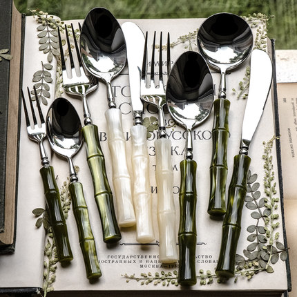 304不锈钢意大利设计师ins轻奢复古珠光竹节柄仿玉西餐刀勺叉套装