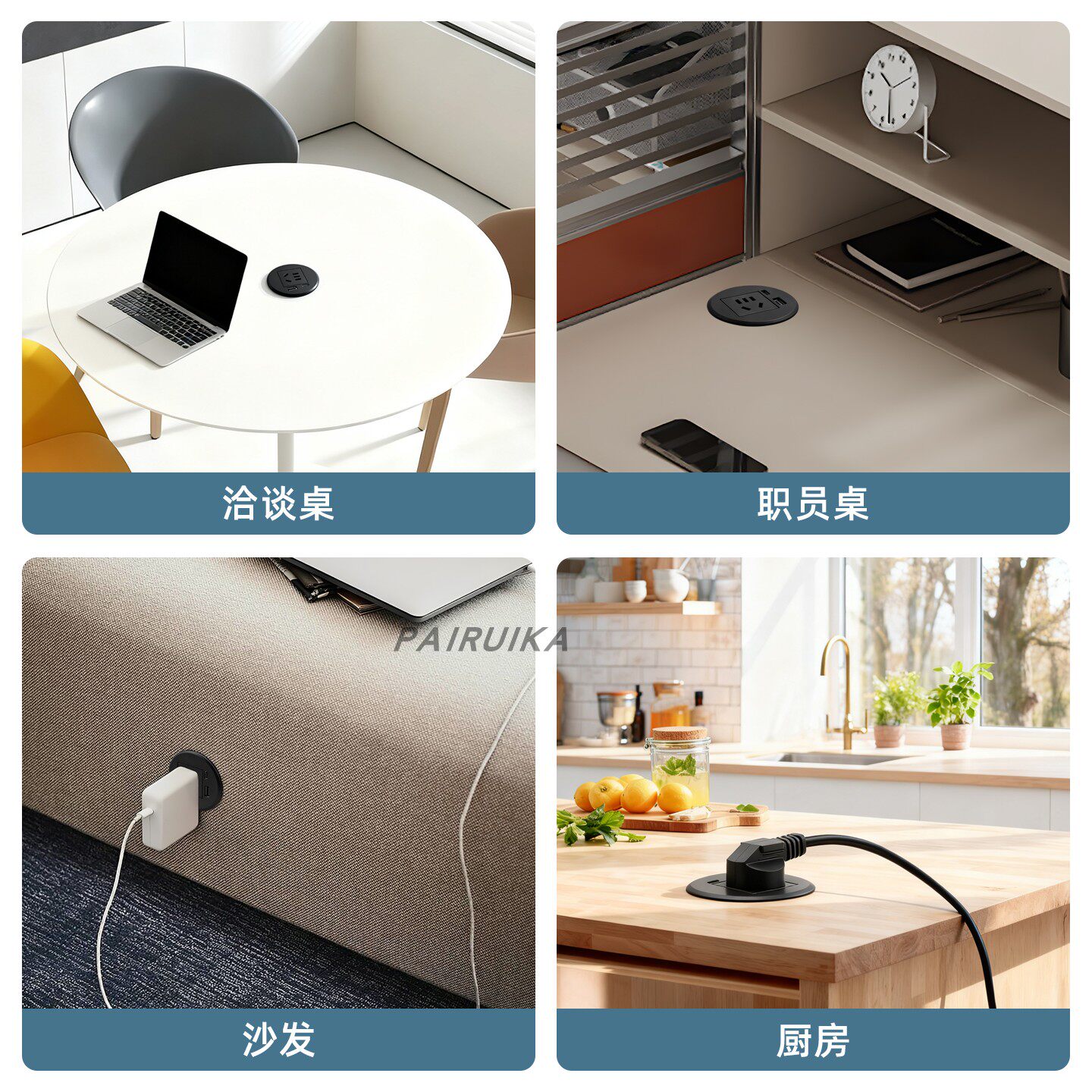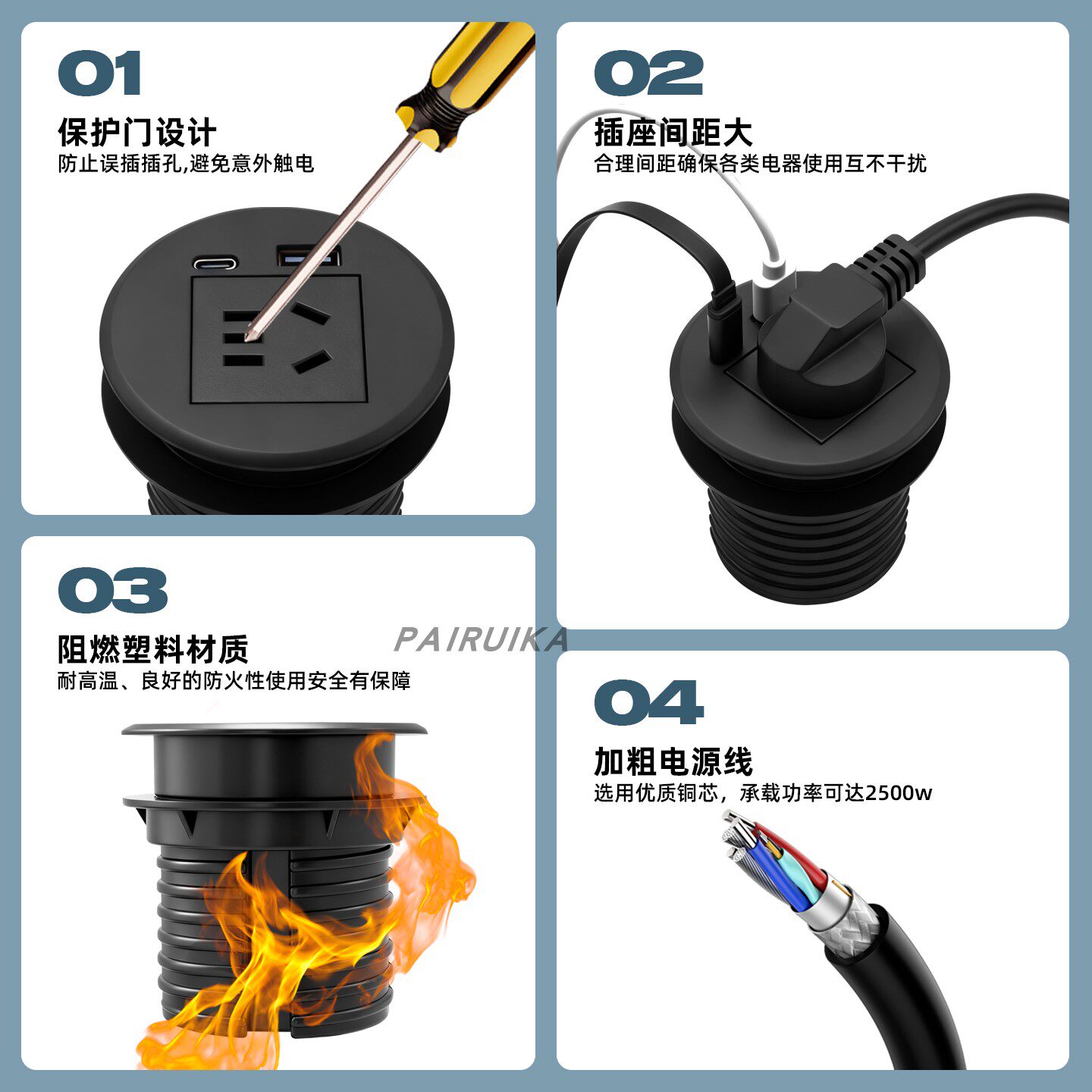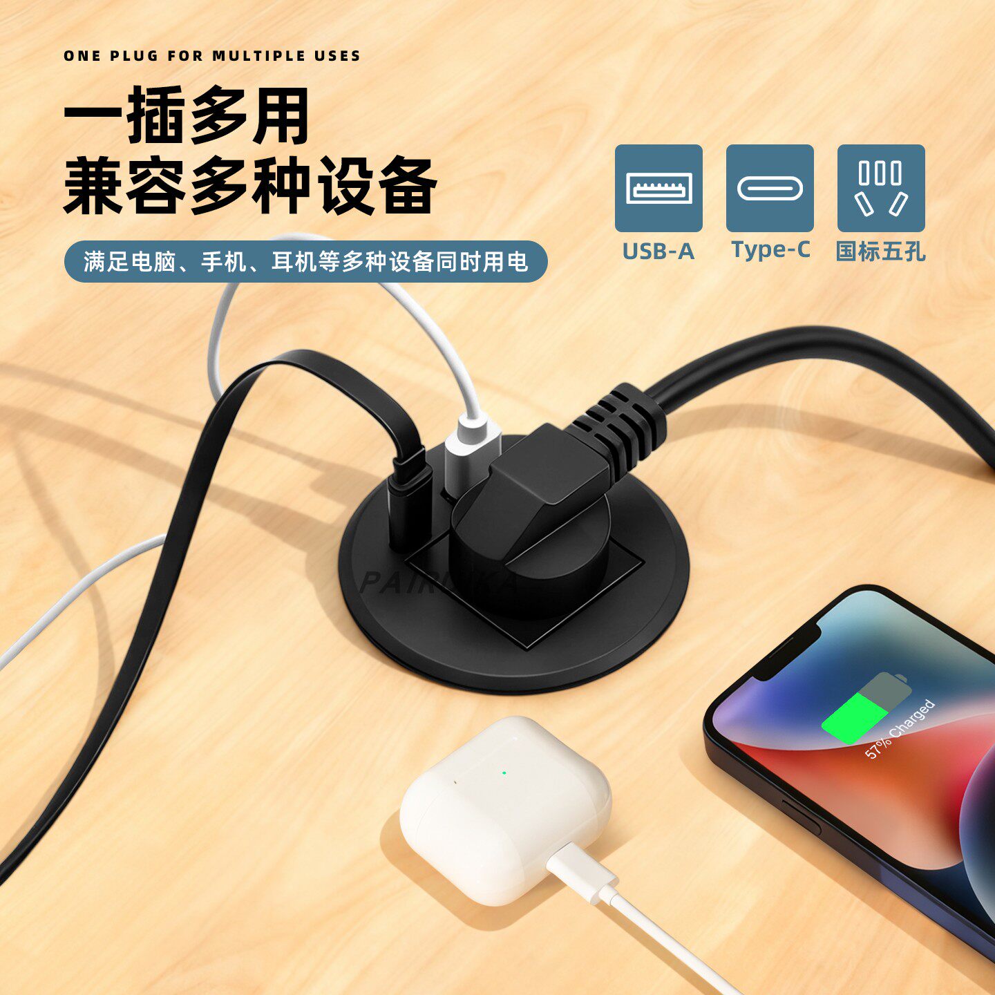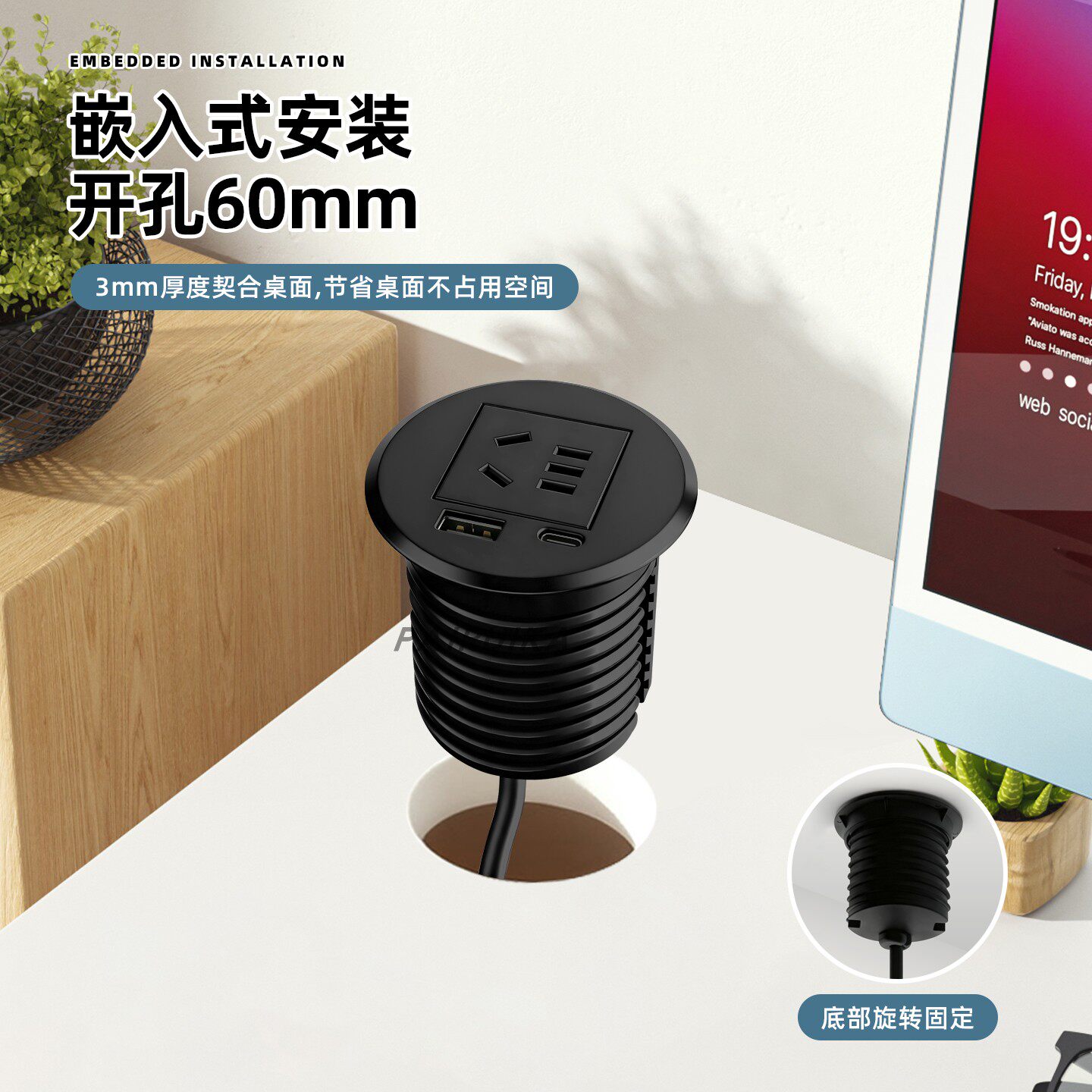 桌面嵌入式圆形插座接线板桌面圆孔孔洞电源插座USB充电60/45mm孔