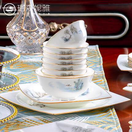 碗碟碗盘金边套装套装景德镇奢家用轻陶瓷器高档现代骨瓷餐具中式