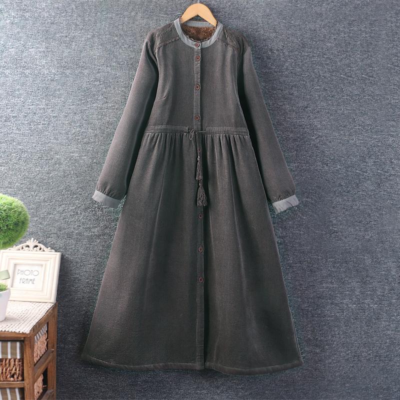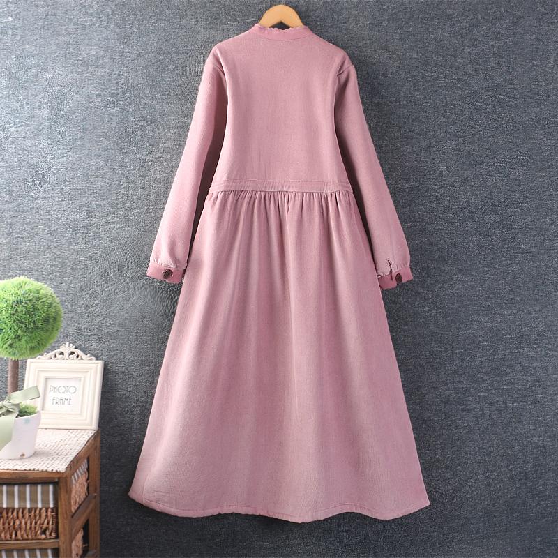 冬装新款女装日系甜美圆领灯芯绒棉布加绒长裙长袖宽松加厚连衣裙