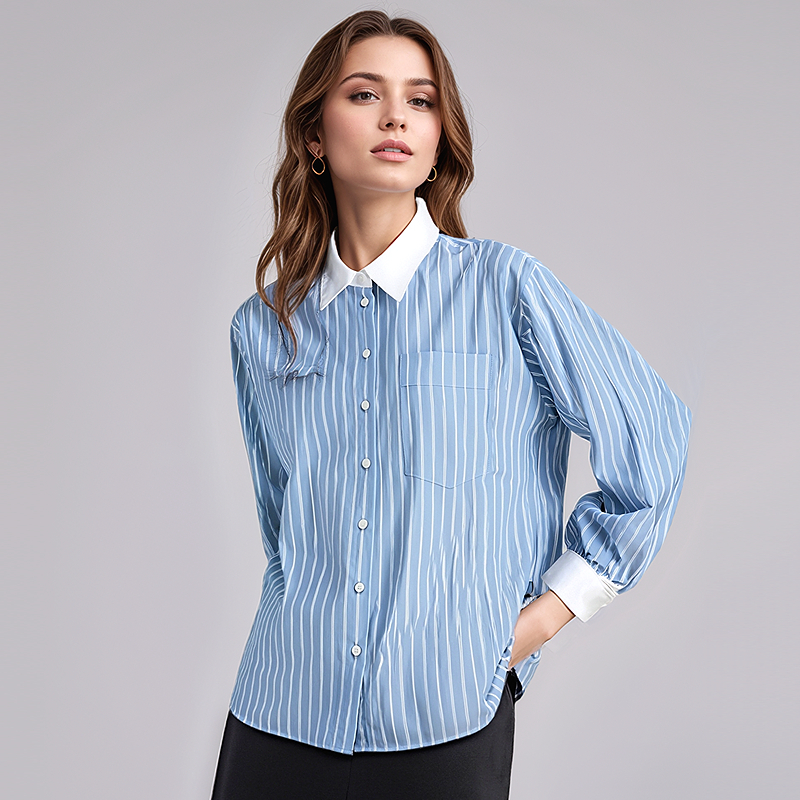 条纹衬衫女士2025春季新款宽松休闲百搭长袖上衣蓝色职业纯棉通勤