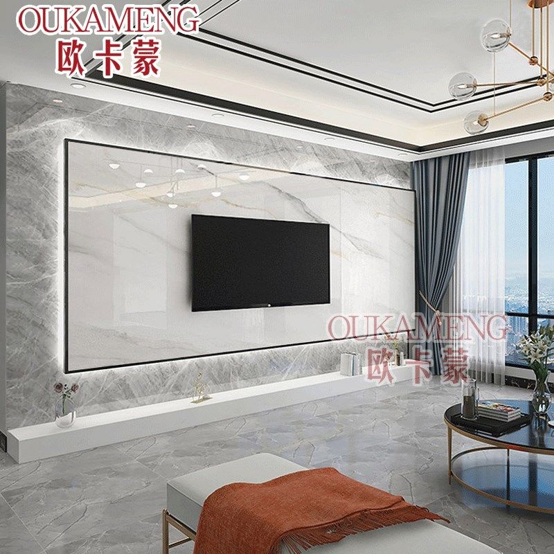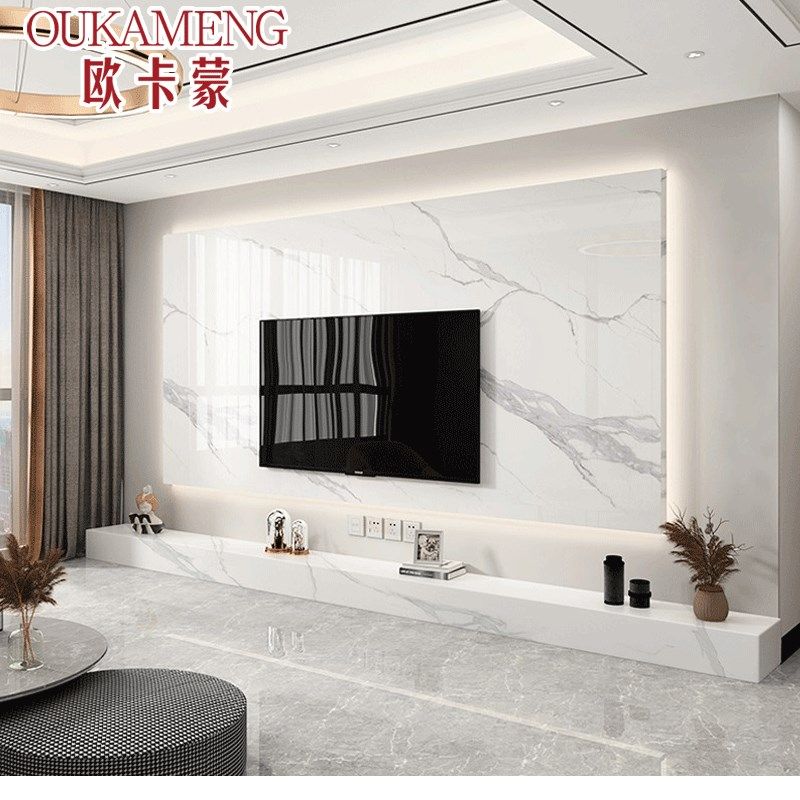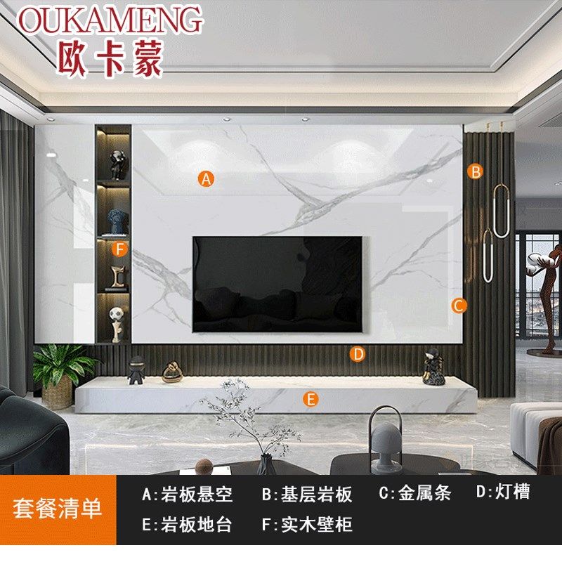 2024悬空岩板电视背景墙瓷砖客厅现代简约实木格栅大理石影视墙