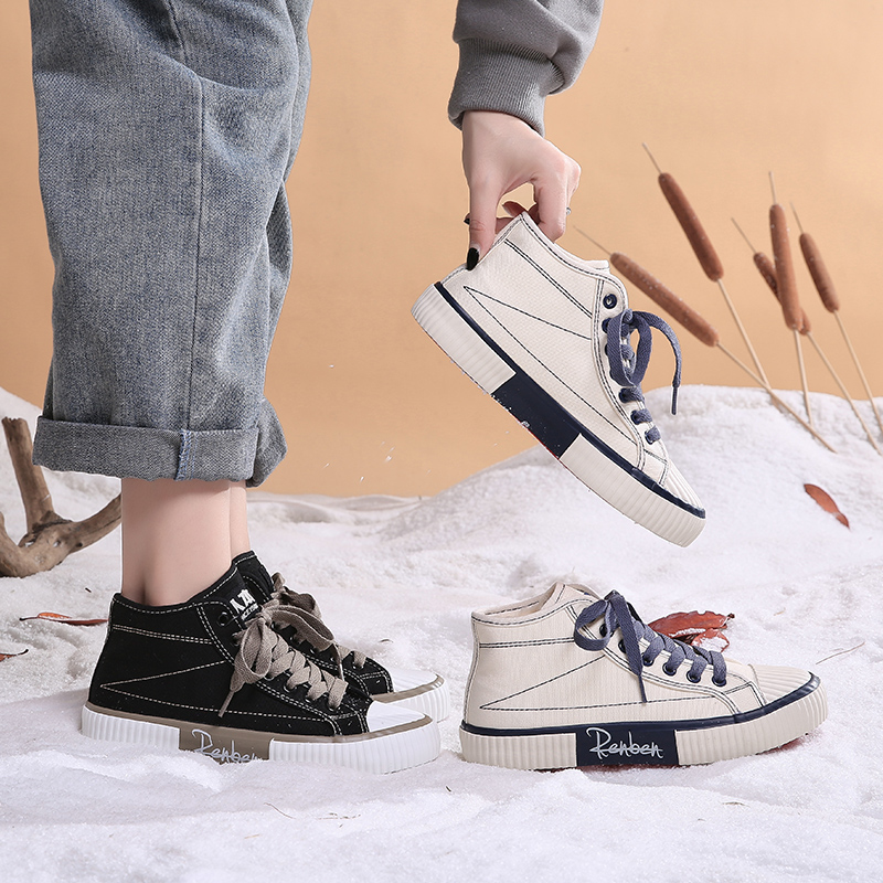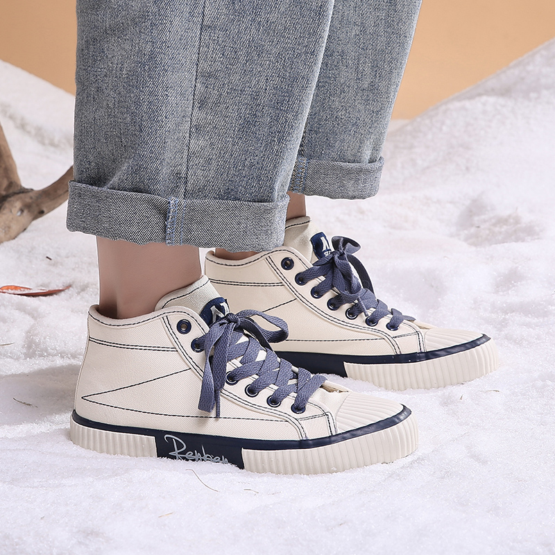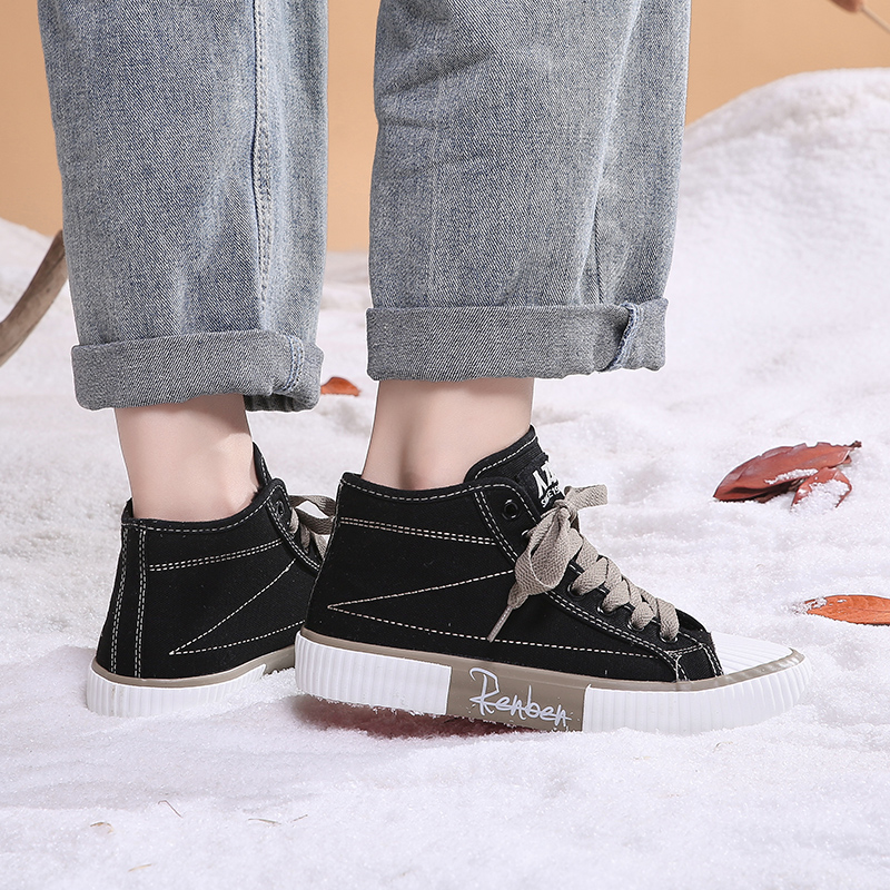 人本高帮加绒帆布鞋女2025秋冬新款饼干板鞋米色冬季学生保暖棉鞋