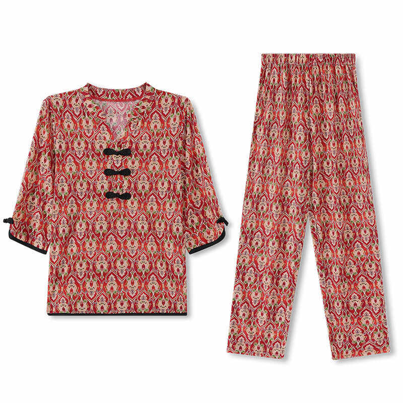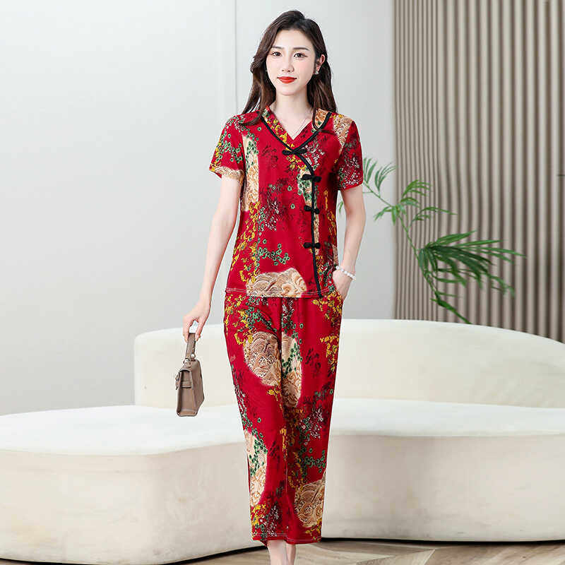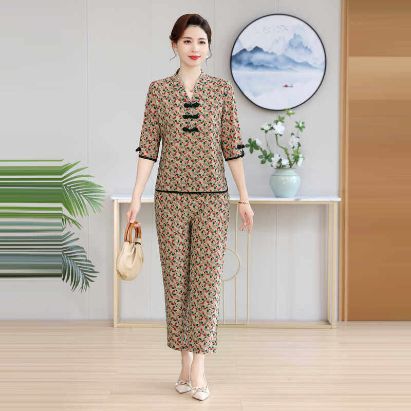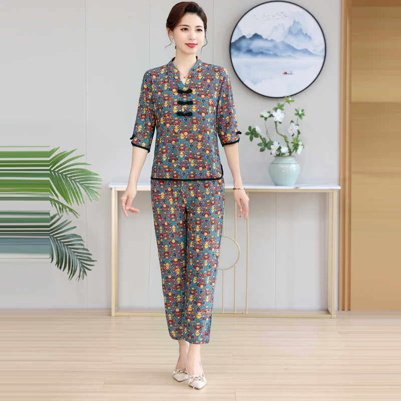 夏季民族风复古碎花七分袖上衣套装妈妈盘扣t恤中老年女式两件套