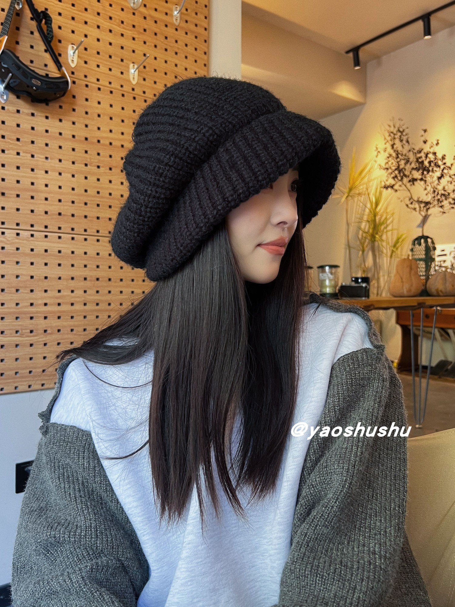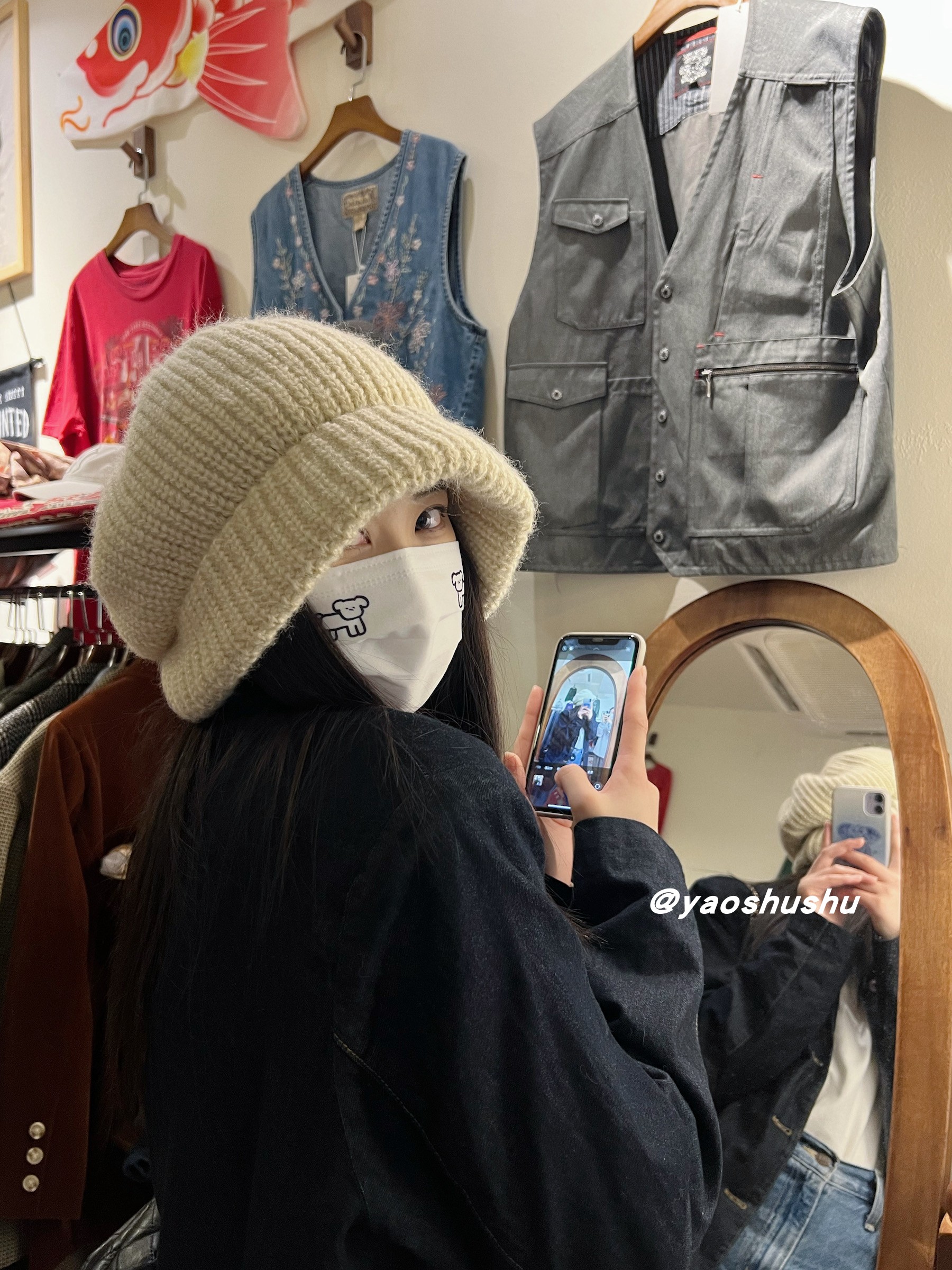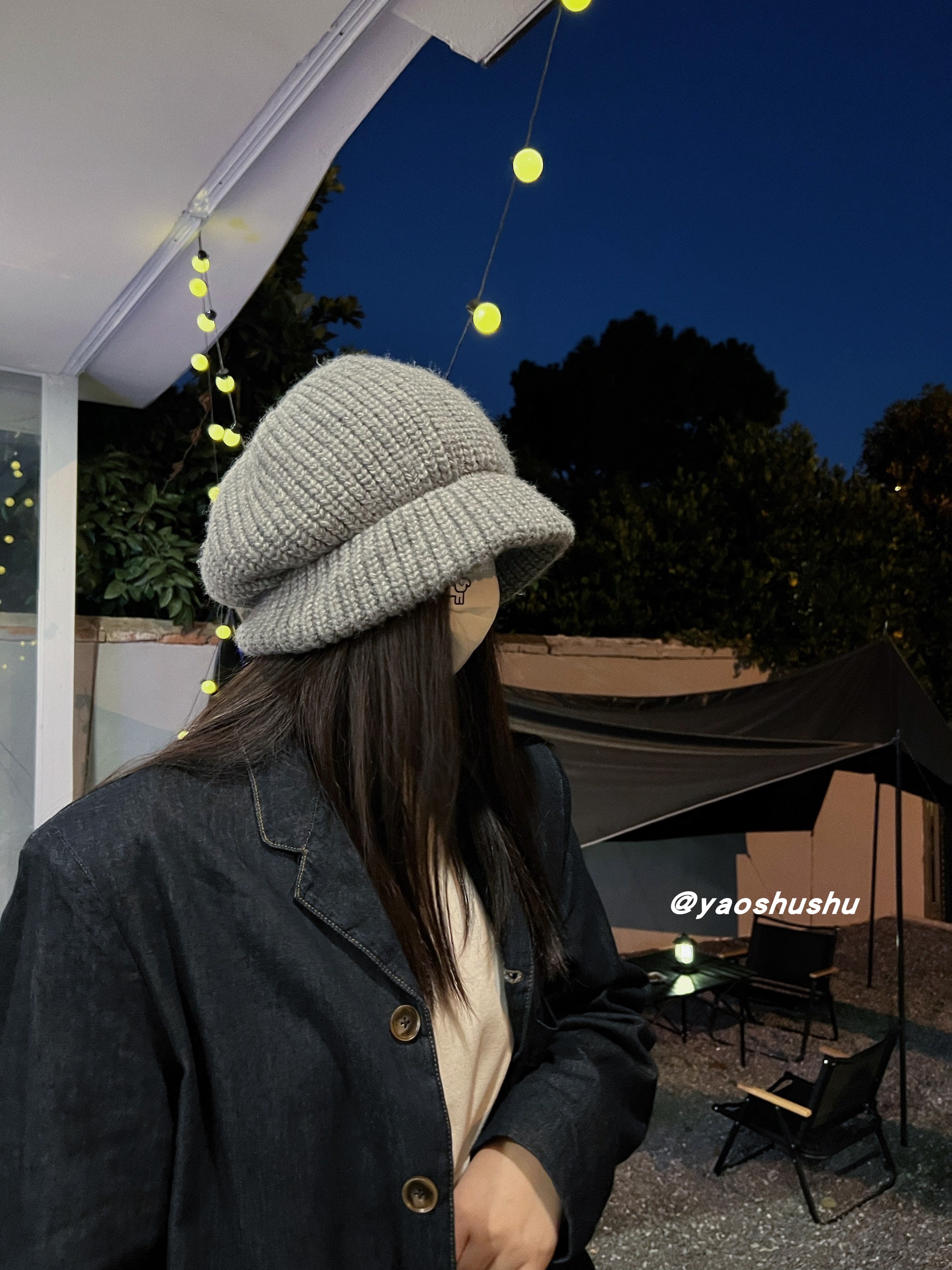 巨显白姜黄色!冬季百搭厚实保暖大头围水母毛线帽护耳针织堆堆帽
